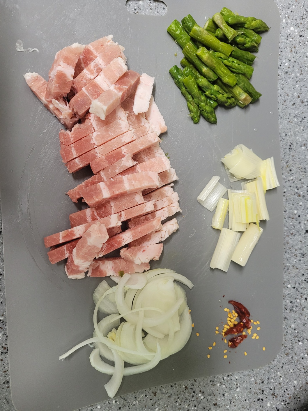 삼겹살 2줄, 그린빈 또는 아스파라거스 300g, 베트남 고추 10개, 파 흰부분 1대, 다진 마늘1스푼