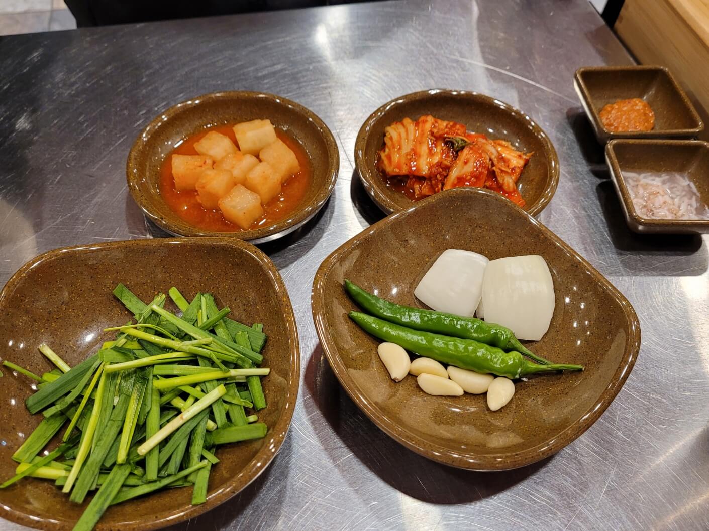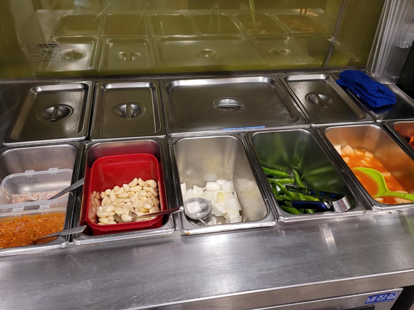 주문하자마자 나오는 밑반찬이고 부족하면 셀프바에서 더 가져다 드실 수 있어요.