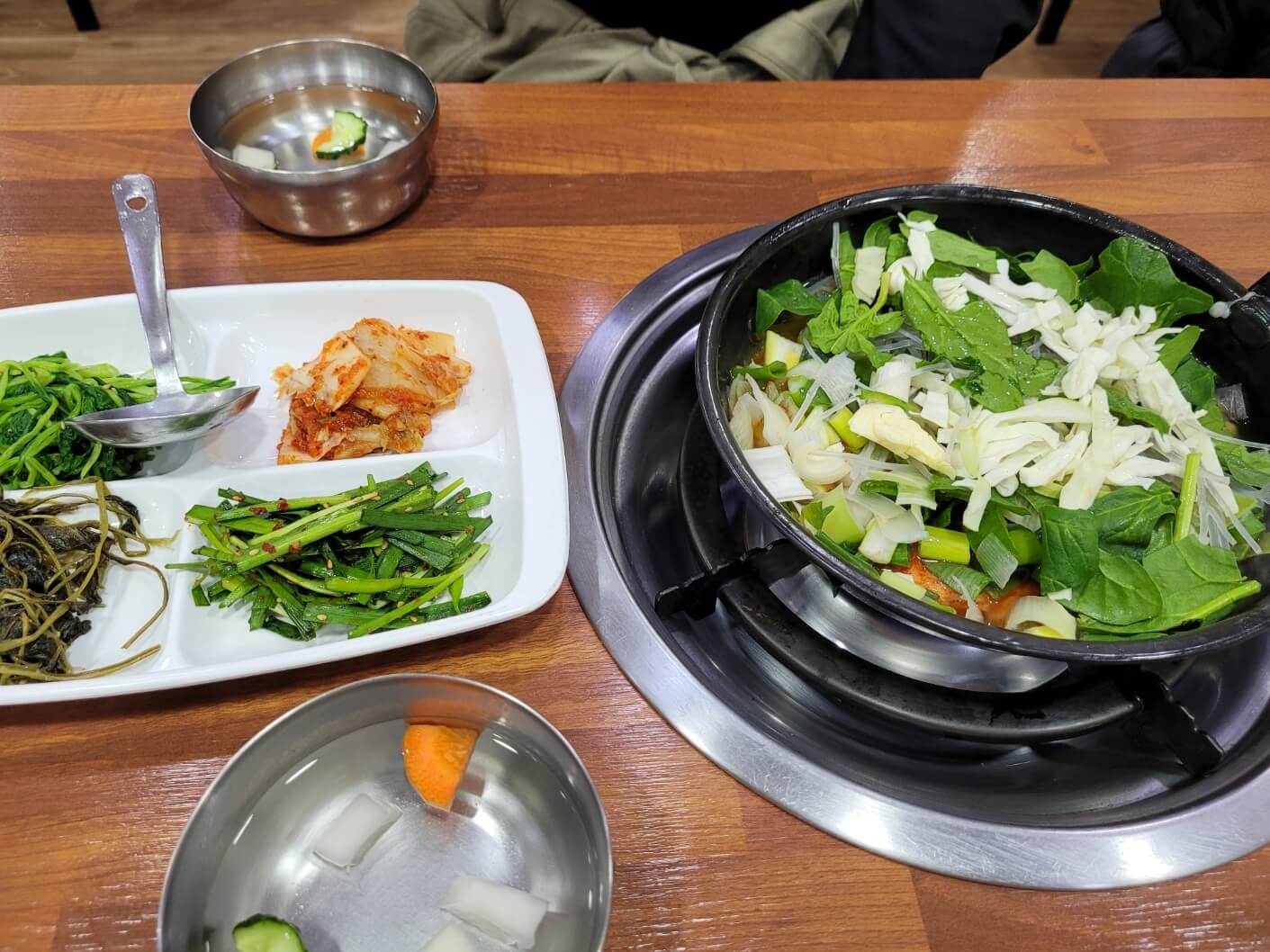 밑반찬은 깔끔한 김치와 더불어 나물류, 시원한 냉국이 나와요.