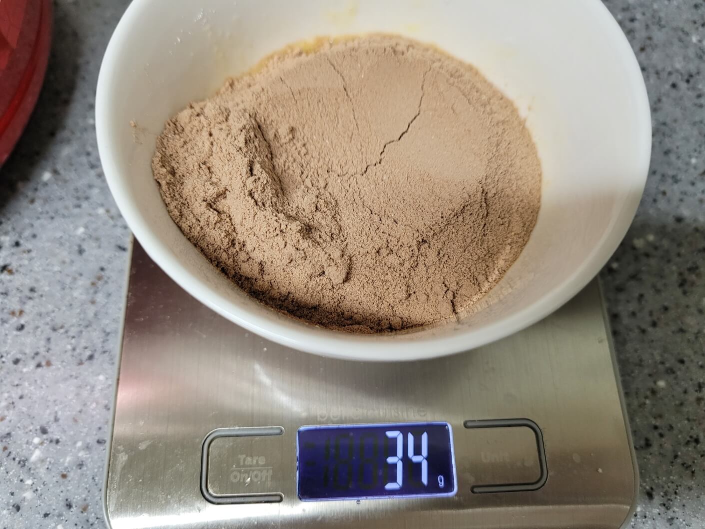 - 알룰로스 분말을 넣고 잘 섞어준 후 프로틴 파우더와 코코아 파우더, 베이컹 파우더를 넣고 잘 섞어줍니다.(참고로 저는 프로틴 파우더가 초코맛이고 코코아파우더가 없어서 프로틴 파우더를 34g 넣었습니다.)