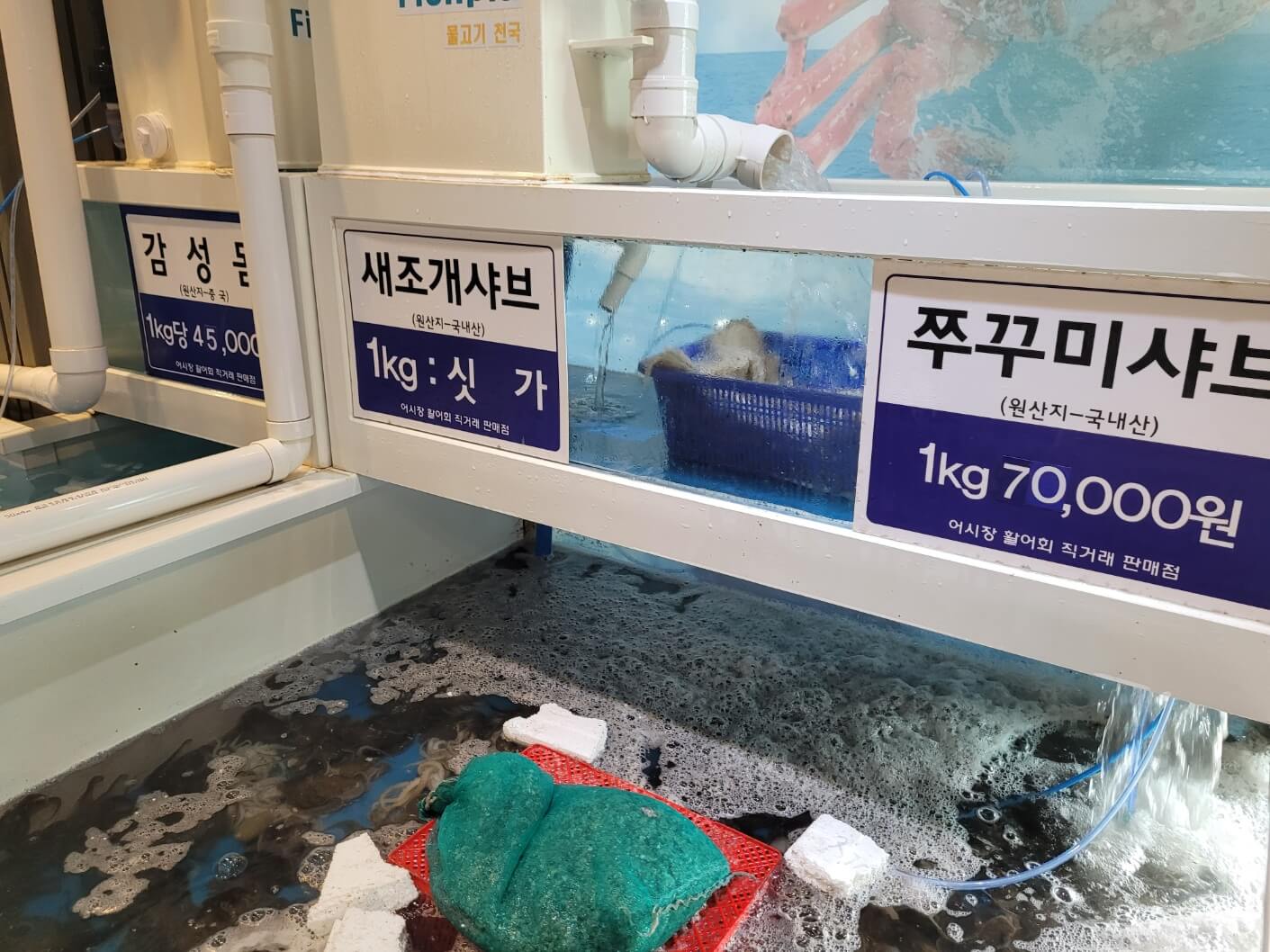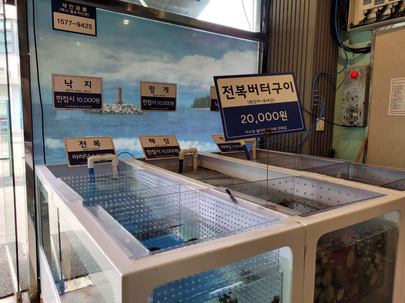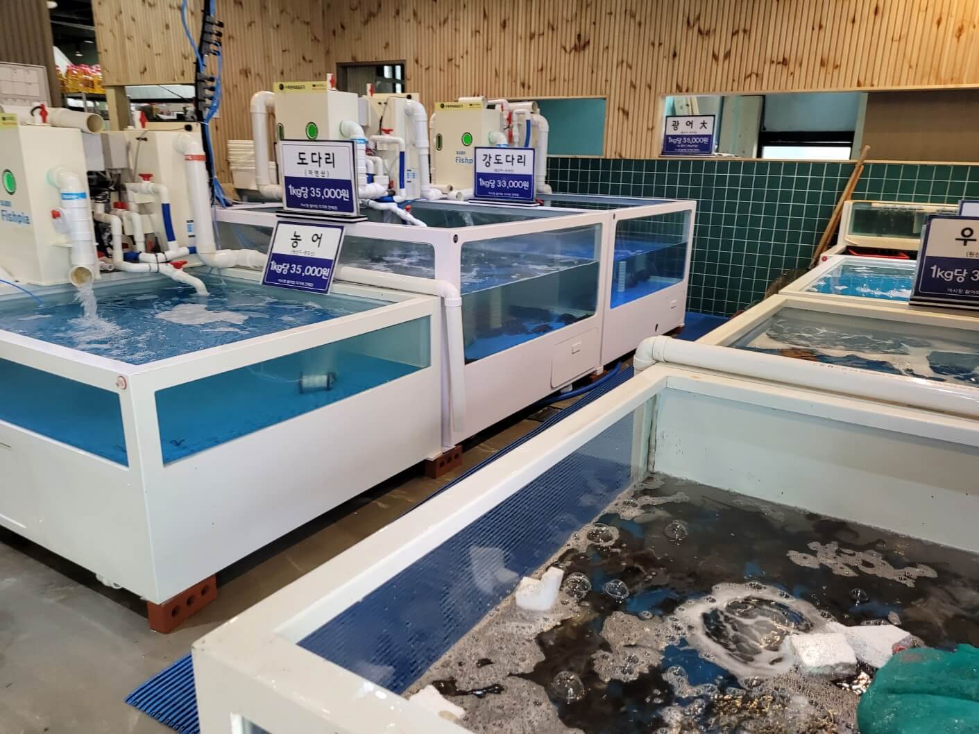 신선한 생선들과 쭈꾸미, 전복, 해삼, 낙지 등이 깨끗한 수조에 가득했어요.