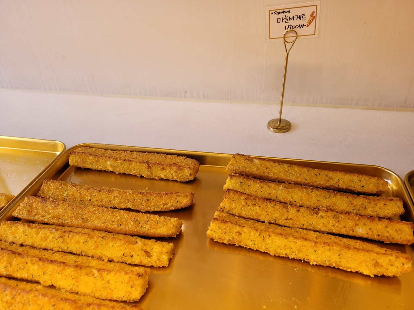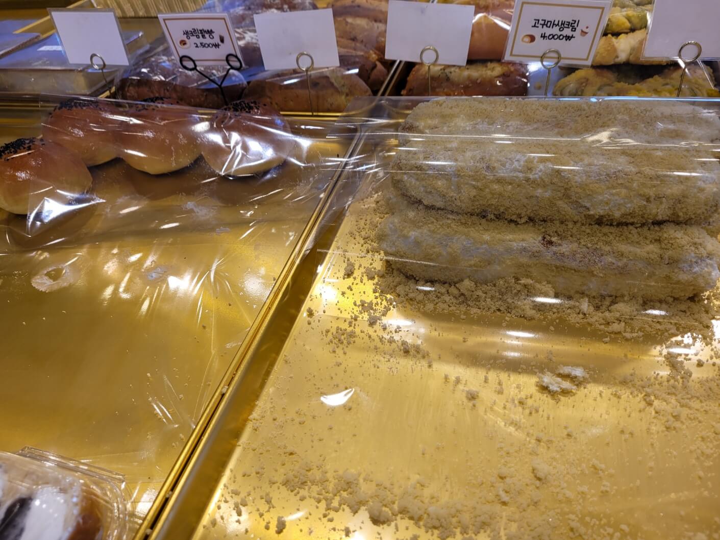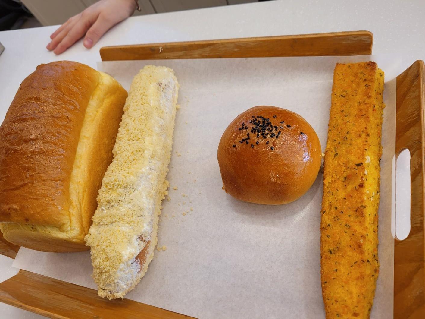 식빵은 빵 자체로도 고소하고, 마늘 바게뜨도 달달하고 쫀쫀하며, 생크림 단팥빵은 그리 특색이 없었는데 고구마크림빵이 진짜 맛있었어요.