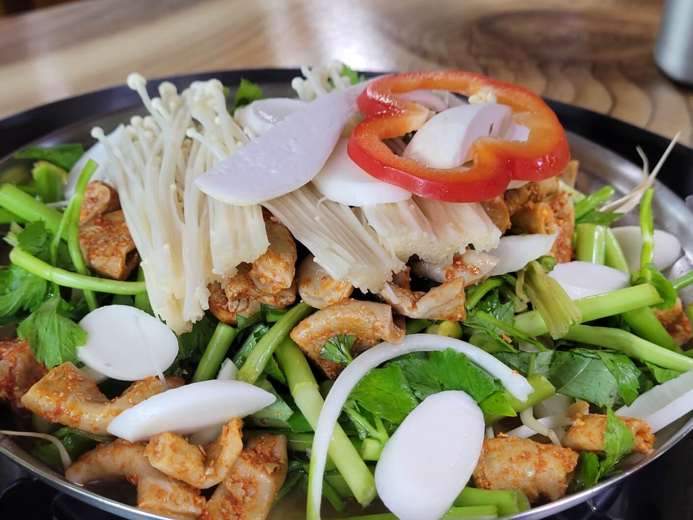 곱창 및 야채가 가득하고 조금씩 끓기 시작하면 직원분이 오셔서 면사리를 넣어주시고 잘 섞어주세요.