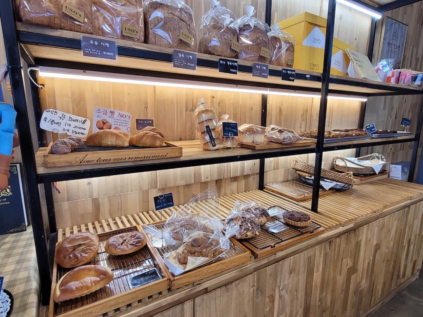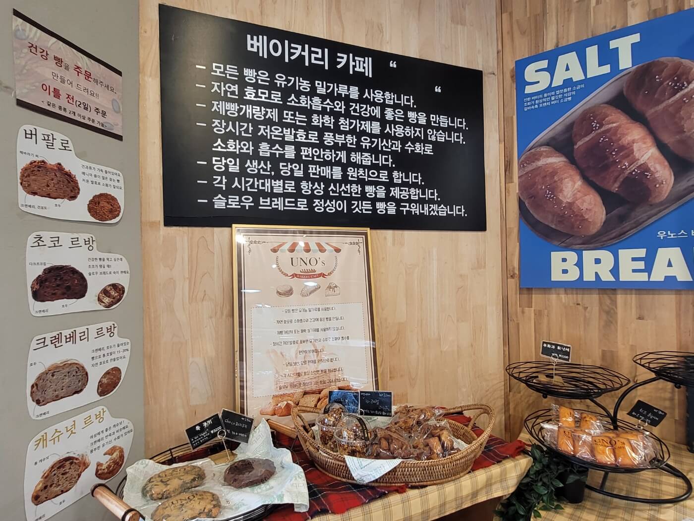 우노스 베이커리의 모든 빵은 유기농 밀가루를 사용합니다. 자연효모로 소화흡수와 건강에 좋은 빵을 만듭니다. 송천동 아띠가 우노스베이커리로 이름을 바꿔 직영점으로 운영한다고 해요.