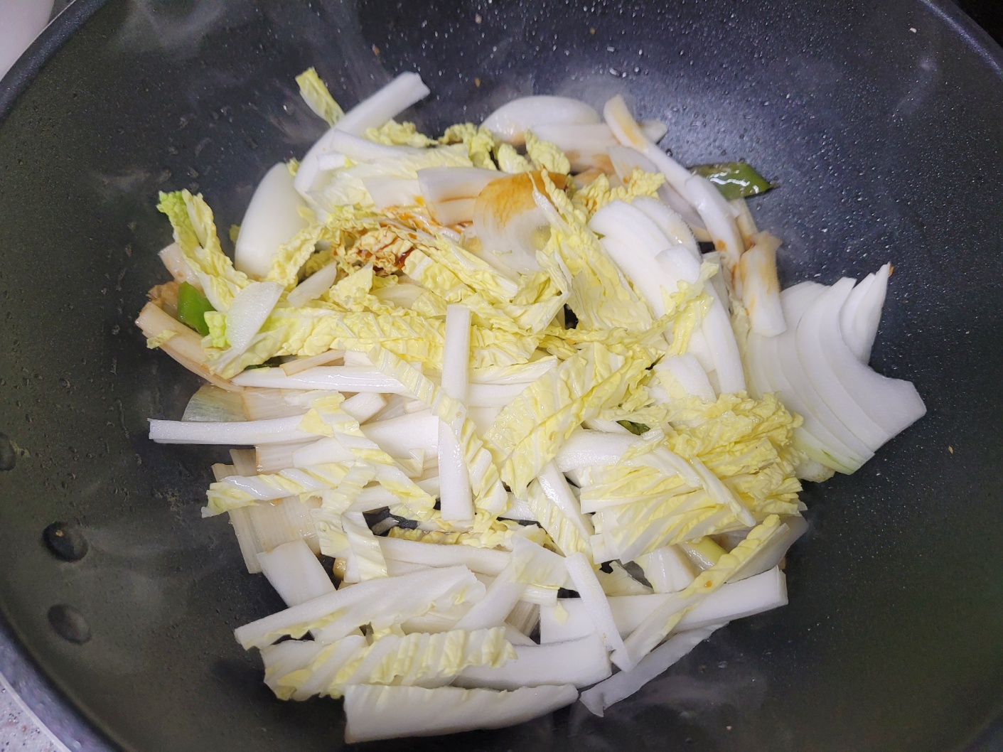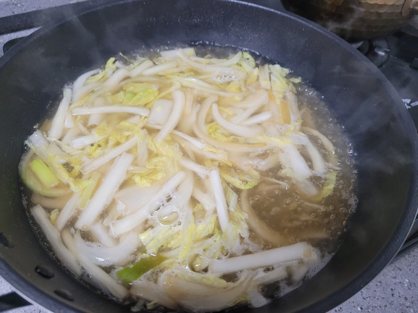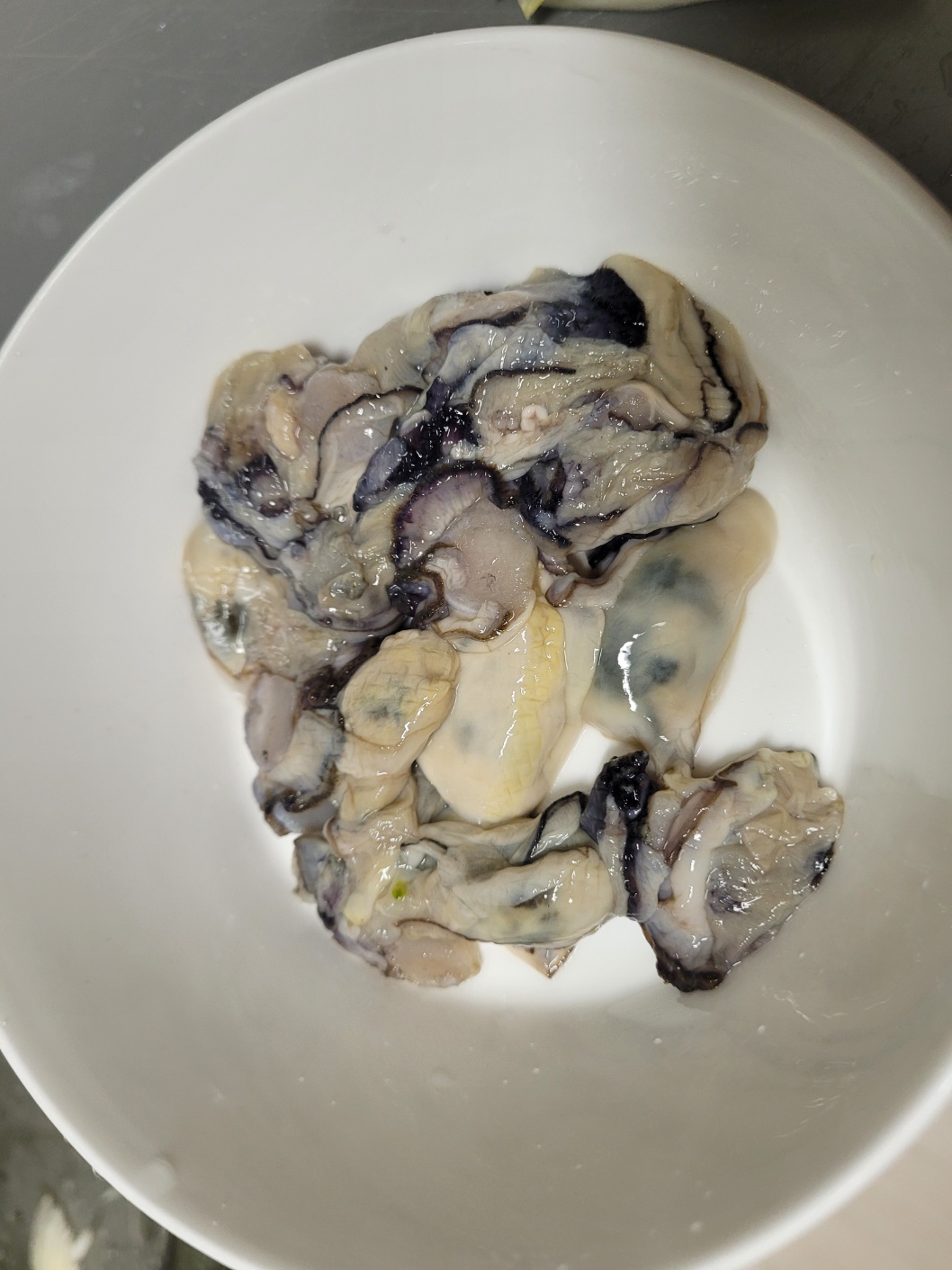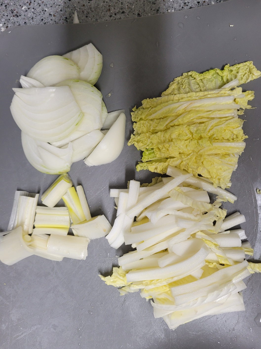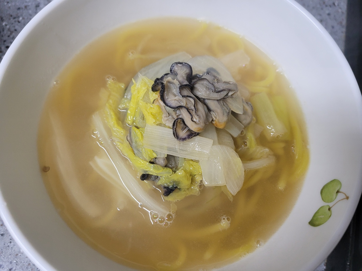 굴 150g, 중국부추(호부추) 한 줌, 큰 양파 1/8개, 배추 한 잎, 청양고추 1개, 파(흰부분) 1대, 다진 생강 1스푼, 중화면 1개, 식용유 2스푼, 간장 1/3스푼, 물 600ml, 소금 1 꼬집, 치킨스톡 분말 1스푼