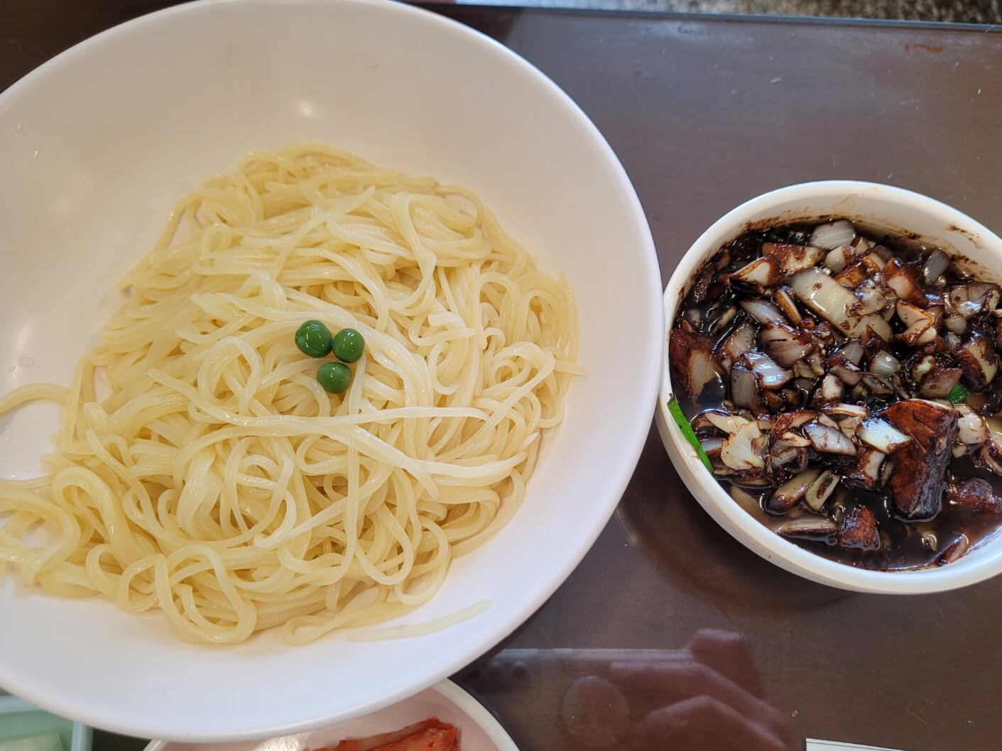 - 우선 간짜장은 면이 매우 얇으면서 건더기에 양파가 매우 아삭아삭 씹혀요. 간이 슴슴하면서도 얇은 면에 잘 베여서 다른 집 간짜장과는 맛이 다릅니다.