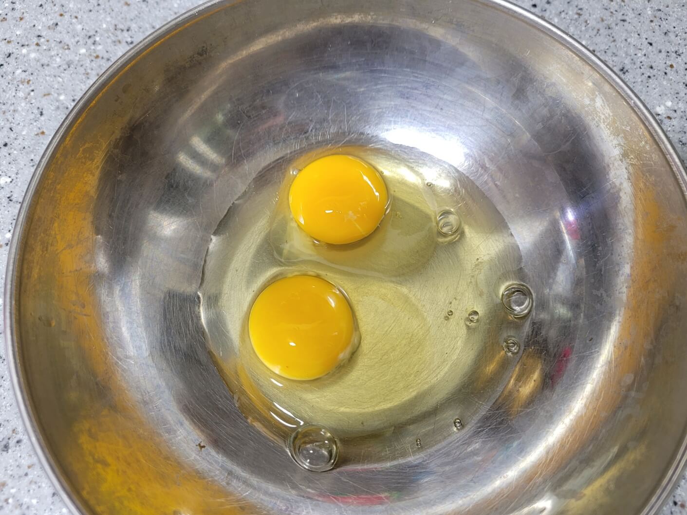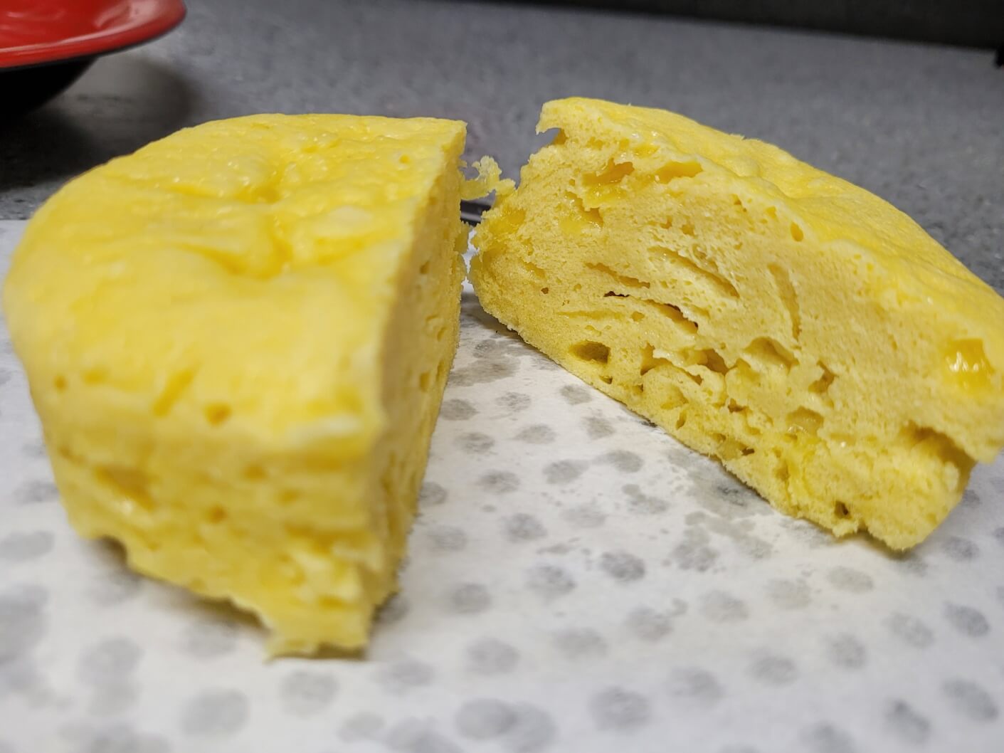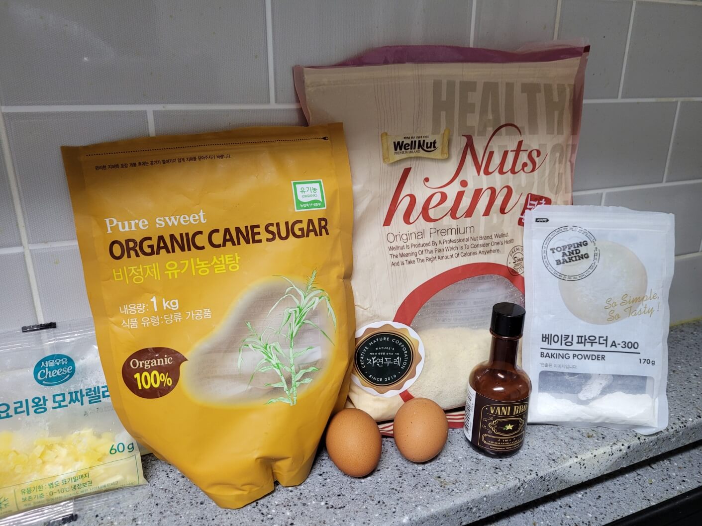 계란 2개, 아몬드가루 4스푼, 모짜젤라치즈 3스푼, 비정제유기농설탕 1스푼, 베이킹파우더 0.2스푼, 바닐라오일 3방울(선택), 소금 한꼬집, 오일 1스푼