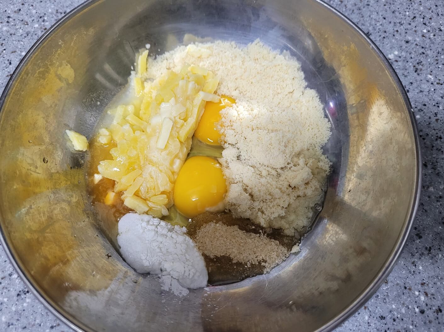 볼에 계란 2개, 아몬드가루 4스푼, 모짜젤라치즈 3스푼, 비정제유기농설탕 1스푼, 베이킹파우더 0.2스푼, 바닐라오일 3방울(선택), 소금 한꼬집을 넣어주세요.