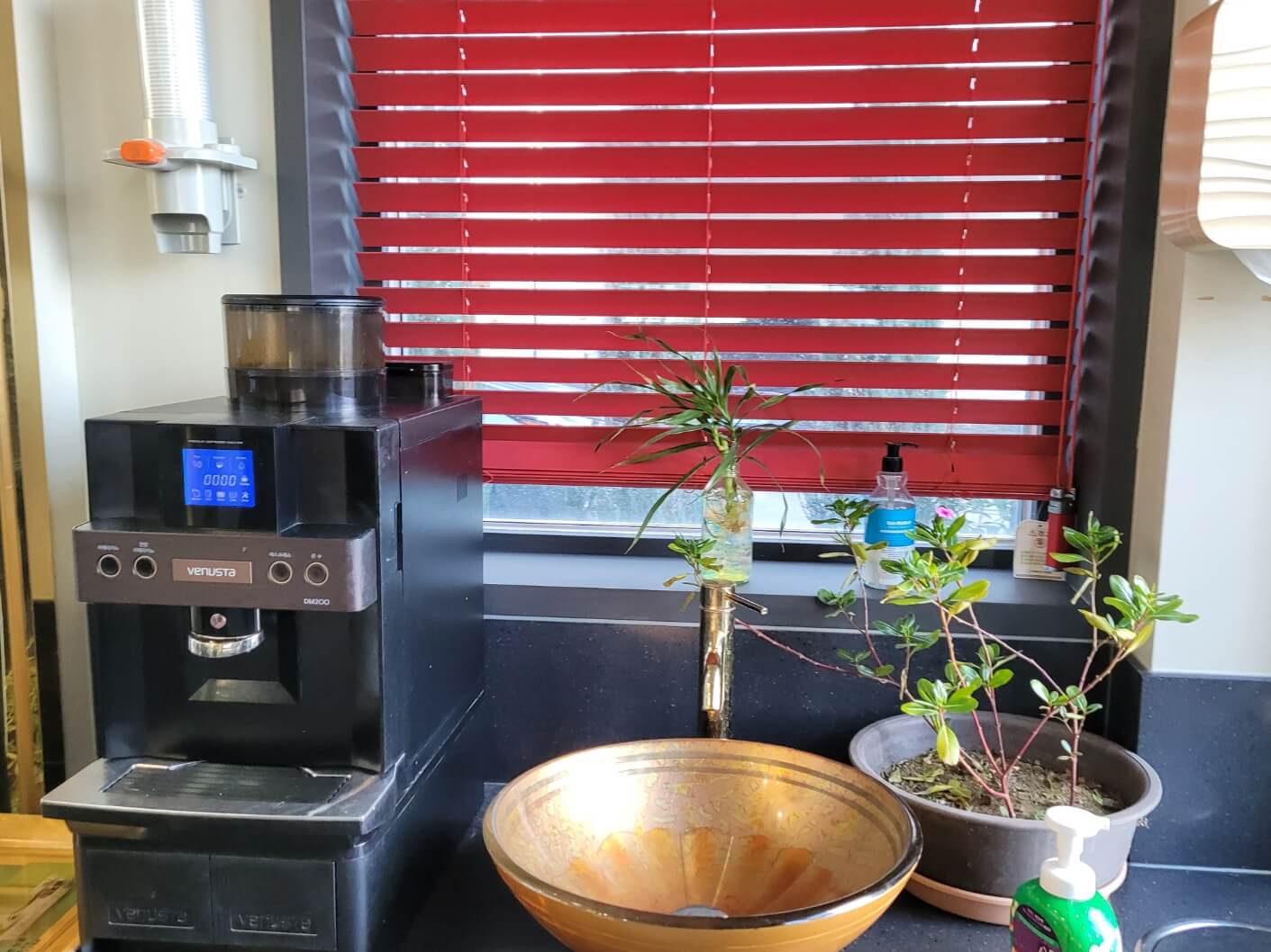 - 가게 입구에는 방문객을 위한 세면대와 커피머신이 있어요.