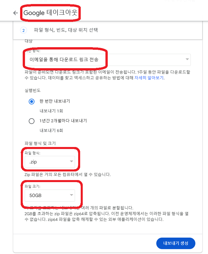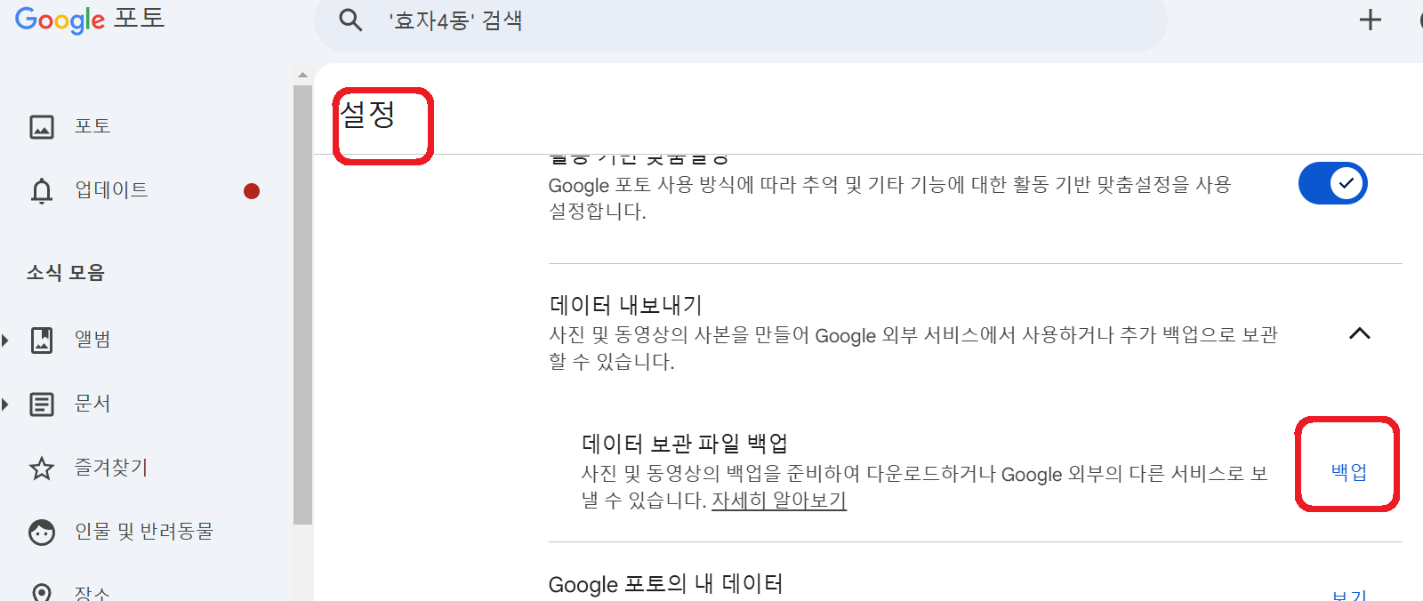 나. '데이터 내보내기'에서 '백업' 부분을 클릭하면 자동으로 구글 테이크아웃으로 연결