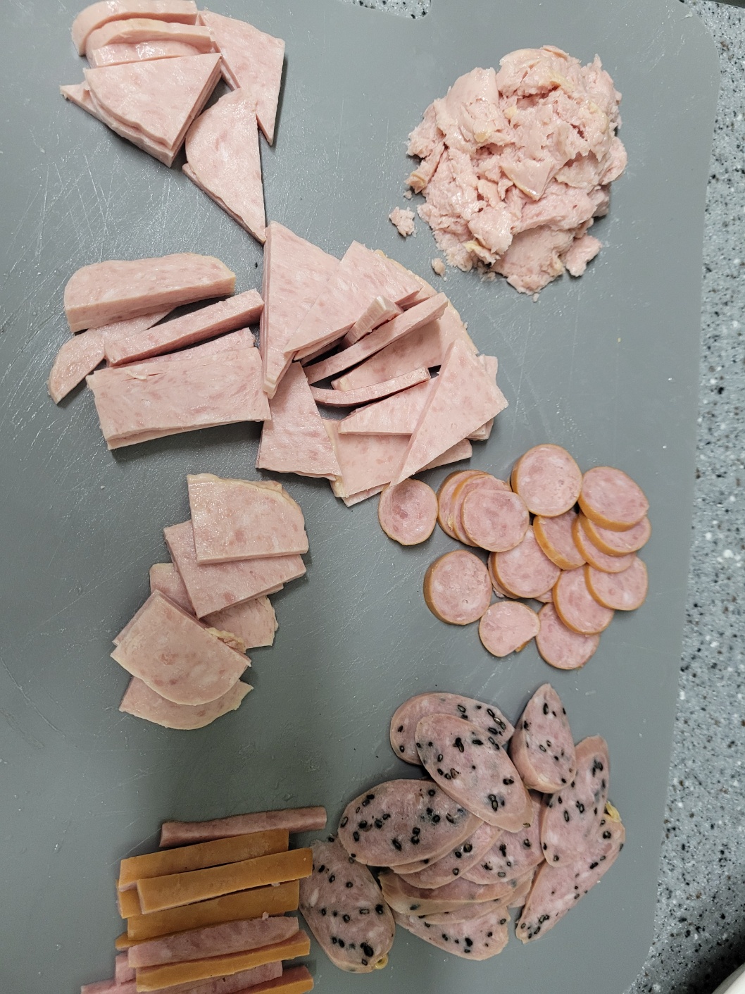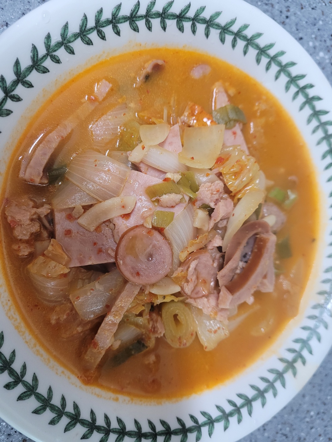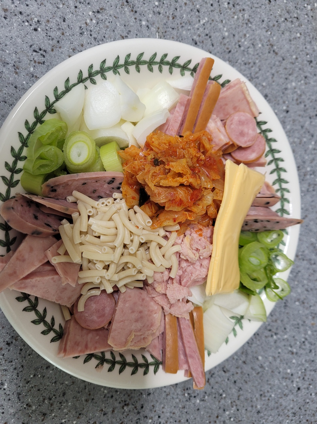 좋아하는 햄 (참고로 아하부장은 카봇소세지 4개, 카봇그라운드비프 100g(안 넣으셔도 돼요.. 맛이 없었어요..), 베이컨 100g, 국산햄 100g), 토마토콩 크게 2스푼, 대파 한뿌리, 청양고추 2개, 양파 1/4개, 두부 반모, 김치와 떡, 마카로니, 치즈 1장은 취향 것