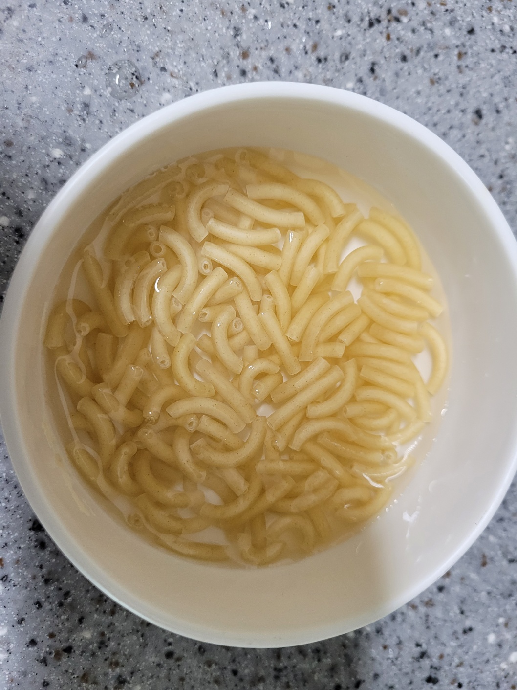 김치는 잘게 가위로 썰어주세요. 마카로니는 찬물에 담궈서 불려 놔 줍니다.