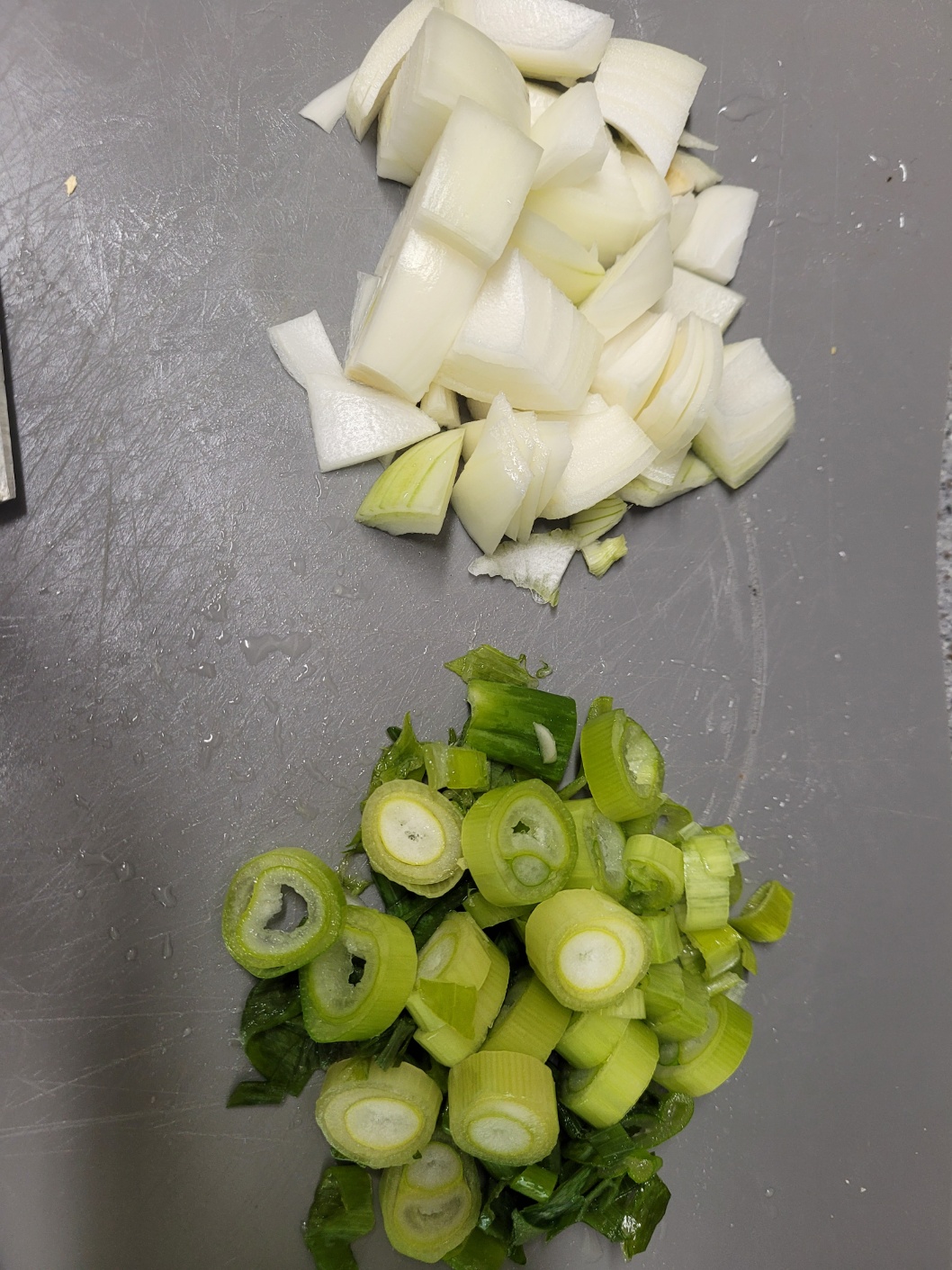 대파는 1cm정도로 송송 썰어주세요. 청양고추도 0.5cm 정도로 작게 썰어줍니다. 그리고 양파와 두부는 큐브로 작게 썰어주세요. (저희는 두부 생략)