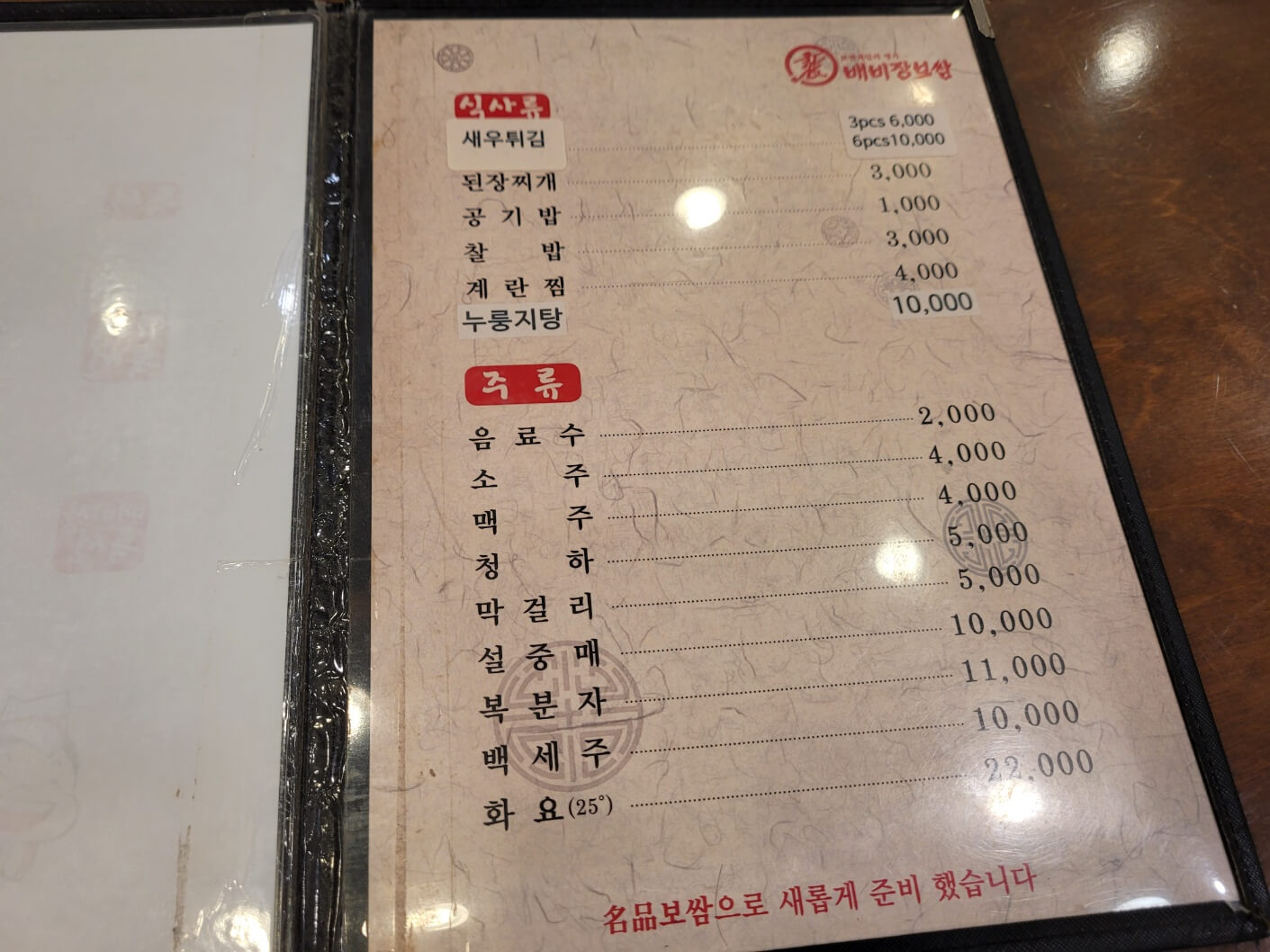 - 배비장 특선: 점심 특선 메뉴로, 고기 양은 일반 배비장 보쌈이나 모둠 보쌈보다 적지만, 식사가 추가로 제공됩니다. 식사는 일반 식사(밥+된장찌개), 묵막국수, 비빔막국수 중 선택할 수 있습니다.