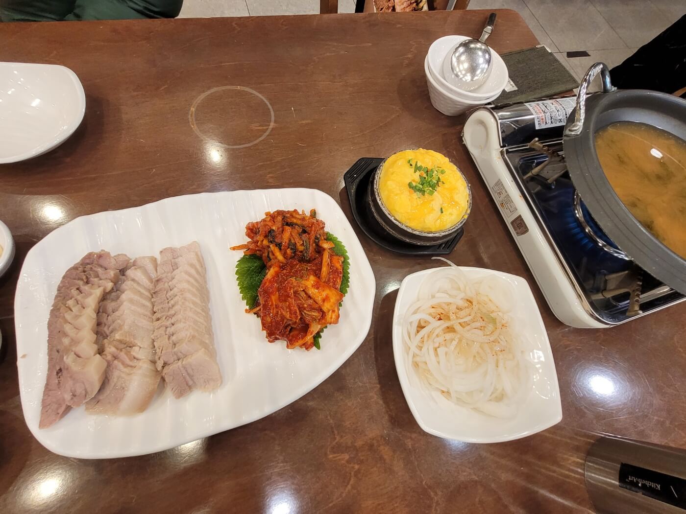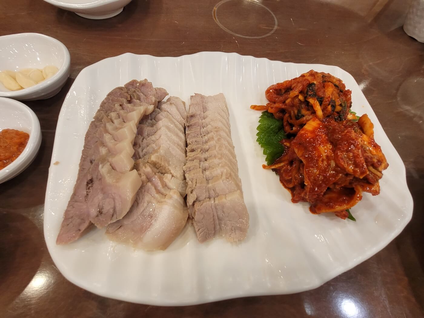 이번 방문에서는 '배비장 보쌈 2인'을 주문하였습니다. 메인인 보쌈과 함께 다양한 반찬들이 정갈하게 차려졌습니다. 보쌈 고기는 부드럽고 잡내 없이 깔끔한 맛이었으며, 함께 제공된 보쌈김치는 적당한 매콤함과 아삭한 식감으로 고기와 완벽한 조화를 이루었습니다. 특히, 계란찜은 고봉처럼 푸짐하게 나와 부드럽고 고소한 맛이 일품이었습니다. 맛보기로 나온 묵막국수는 시원하고 담백하여 보쌈과 함께 먹기에 좋았습니다.