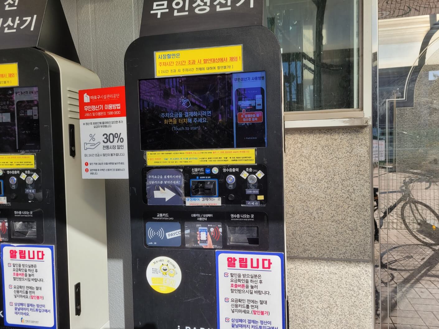 1층 무인정산기에서 카드결제 가능하고 시장 이용 2시간까지는 영수증이 있으면 30% 할인도 가능해요.