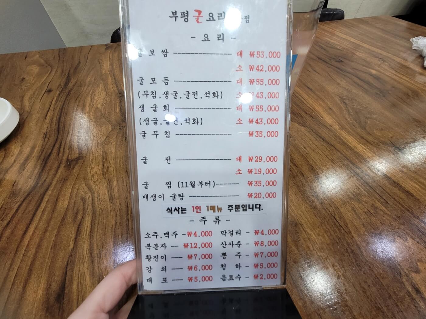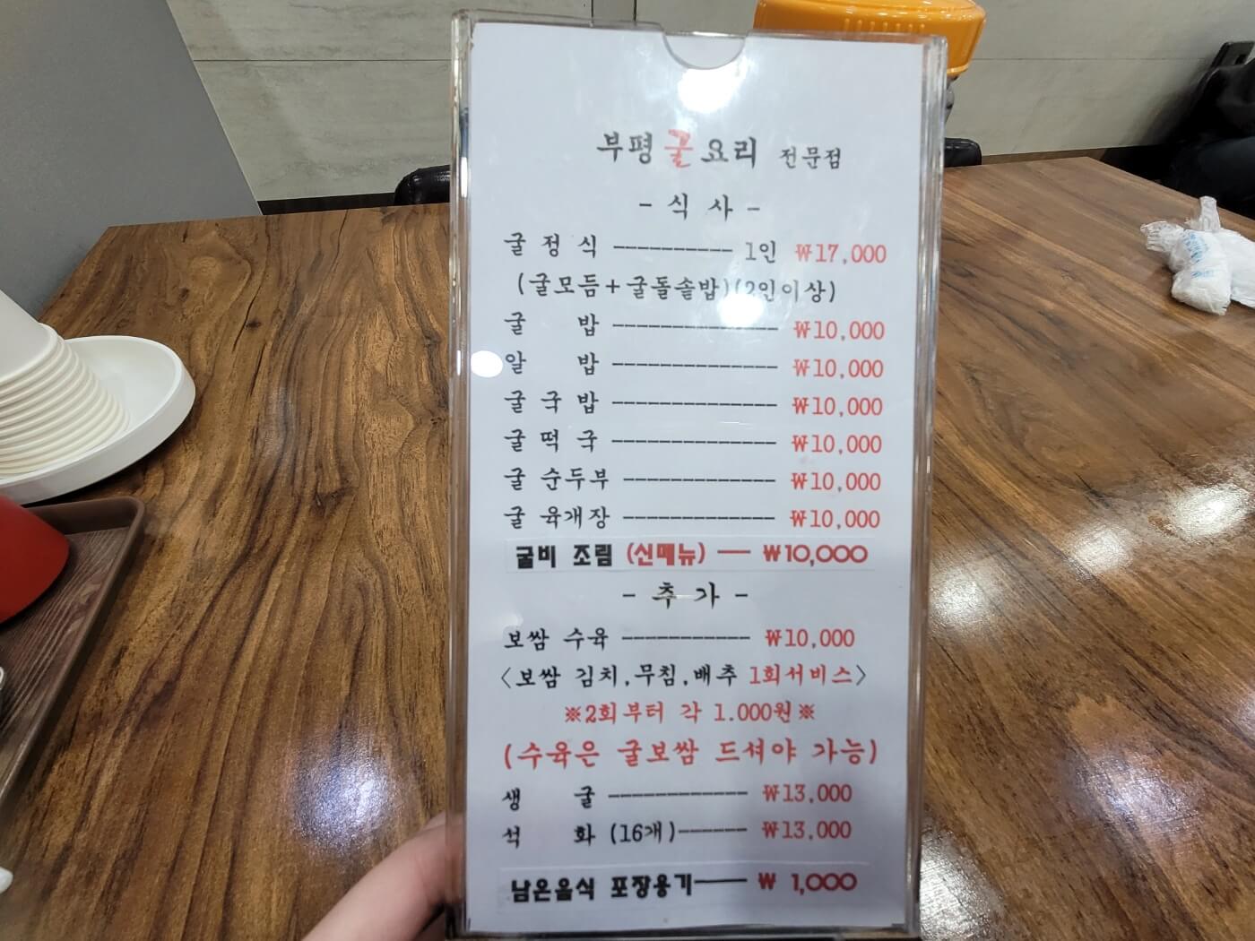 메뉴는 다음과 같아요. 저희는 굴정식 3인분을 주문했어요.