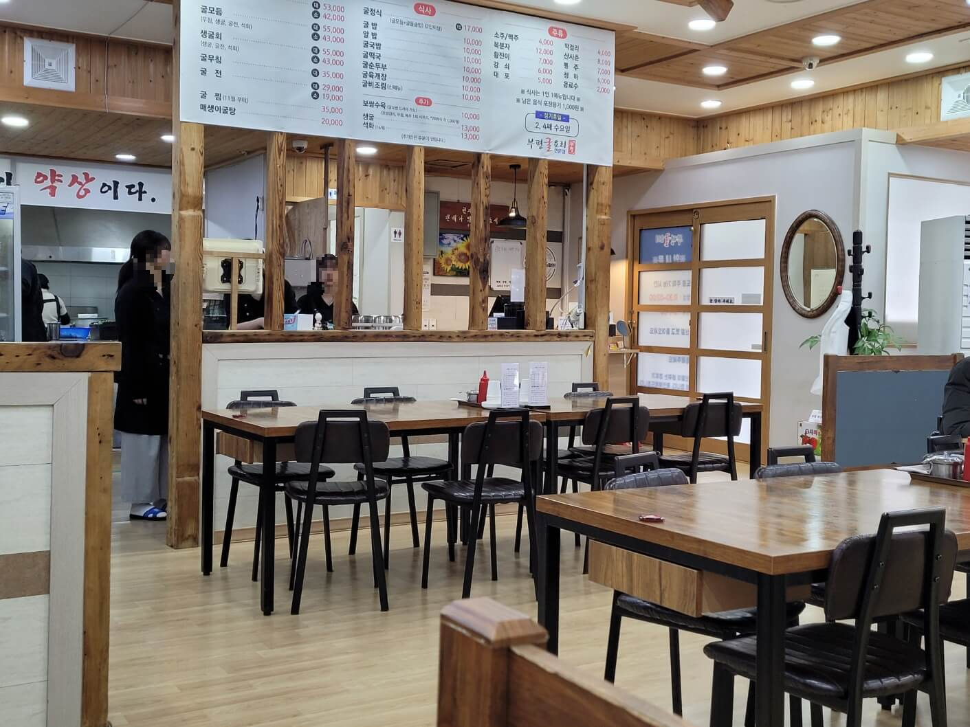 부평굴요리에 들어서면 가장 먼저 깔끔하고 정갈한 매장 내부가 눈에 들어옵니다. 따뜻한 조명이 아늑한 분위기를 자아내며, 곳곳에 신경 쓴 인테리어가 돋보였습니다. 테이블 간격도 넉넉해 조용히 식사하며 대화를 나누기에 좋았어요.