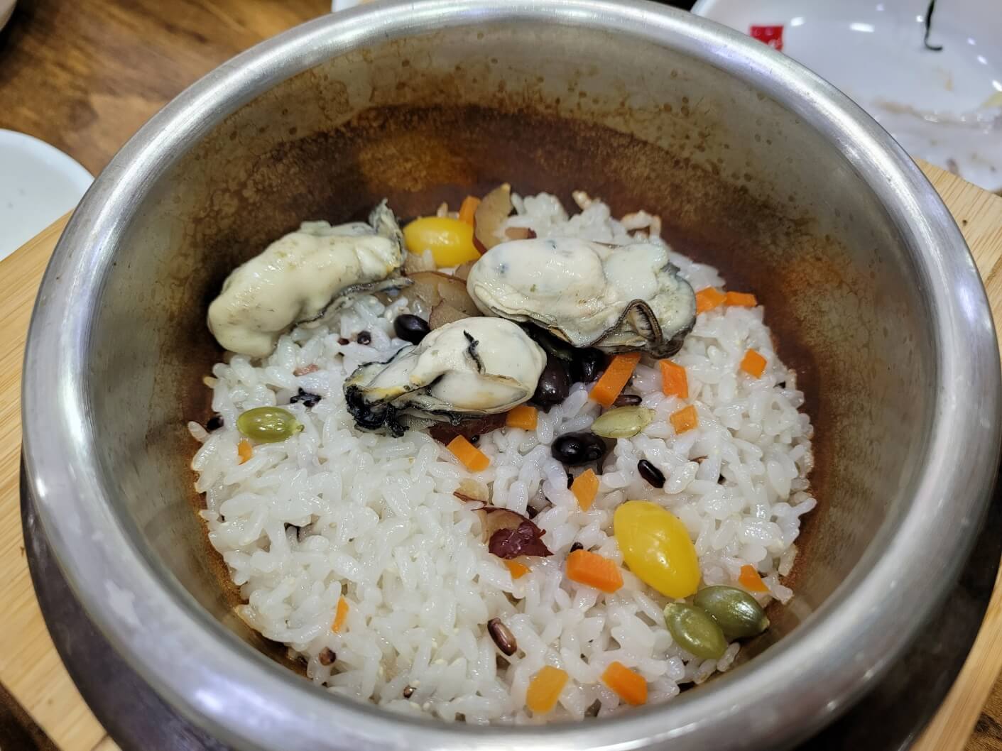 굴정식의 하이라이트는 바로 돌솥밥이었습니다. 갓 지어낸 밥에서는 고소한 향이 솔솔 풍겼고, 밥 위에는 굴이 푸짐하게 올라가 있었습니다. 뜨끈한 밥과 함께 먹는 굴의 맛은 말로 표현하기 어려울 정도로 훌륭했어요.