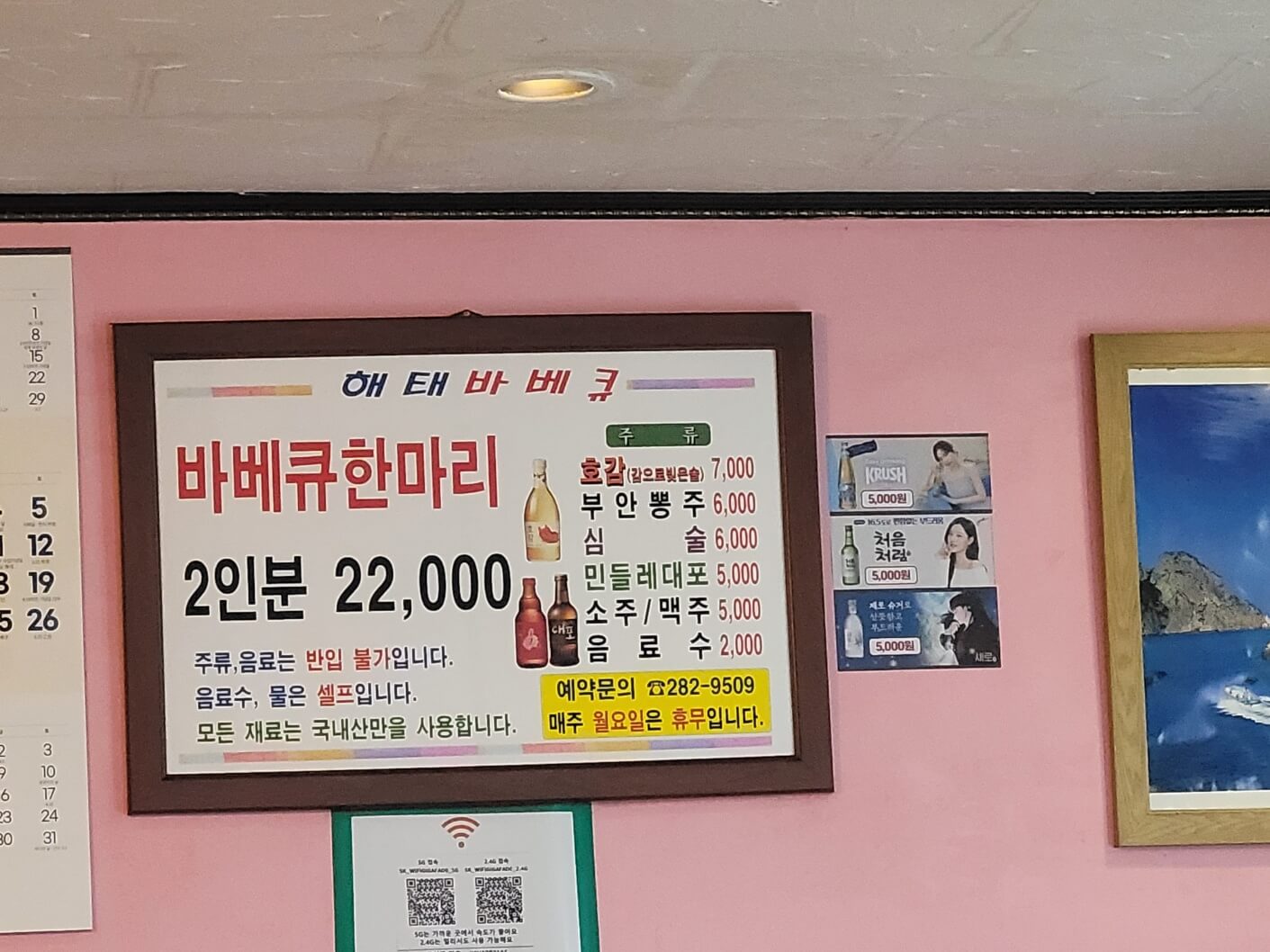해태바베큐의 메뉴는 단 하나, 닭 바베큐(22,000원)에요. 단일 메뉴로 승부하는 만큼 그 맛에 대한 자부심이 느껴져요. 음료로는 맥주와 소주 등이 준비되어 있어요.