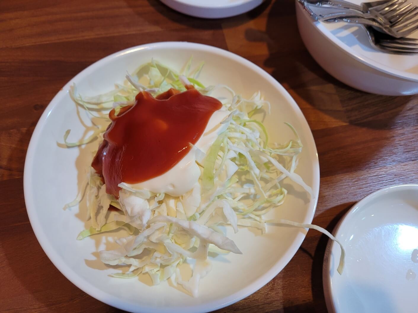 자리에 앉으면 기본 반찬으로 양배추 샐러드와 치킨 무가 제공돼요. 양배추 샐러드는 케첩과 마요네즈로 간단하게 버무려져 있는데, 닭 바베큐와 함께 먹으면 그조화가 일품이에요.