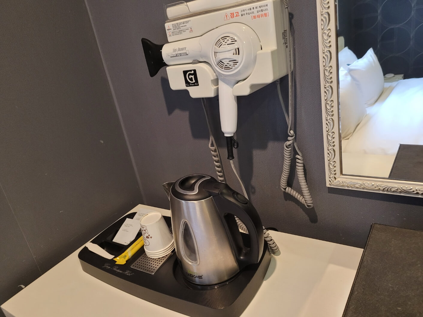 - 편의용품: 전기주전자, 생수 2병, 냉장고, 드라이기, 고데기, 세면도구, 타월 넉넉