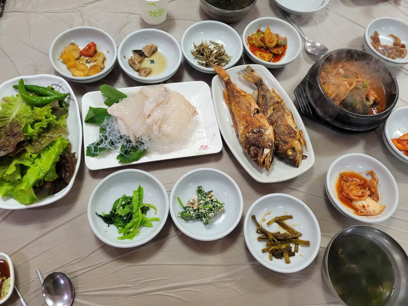 - 밑반찬: 10가지 이상의 반찬이 제공되었는데, 모두 정갈하게 준비되어 있었어요.
