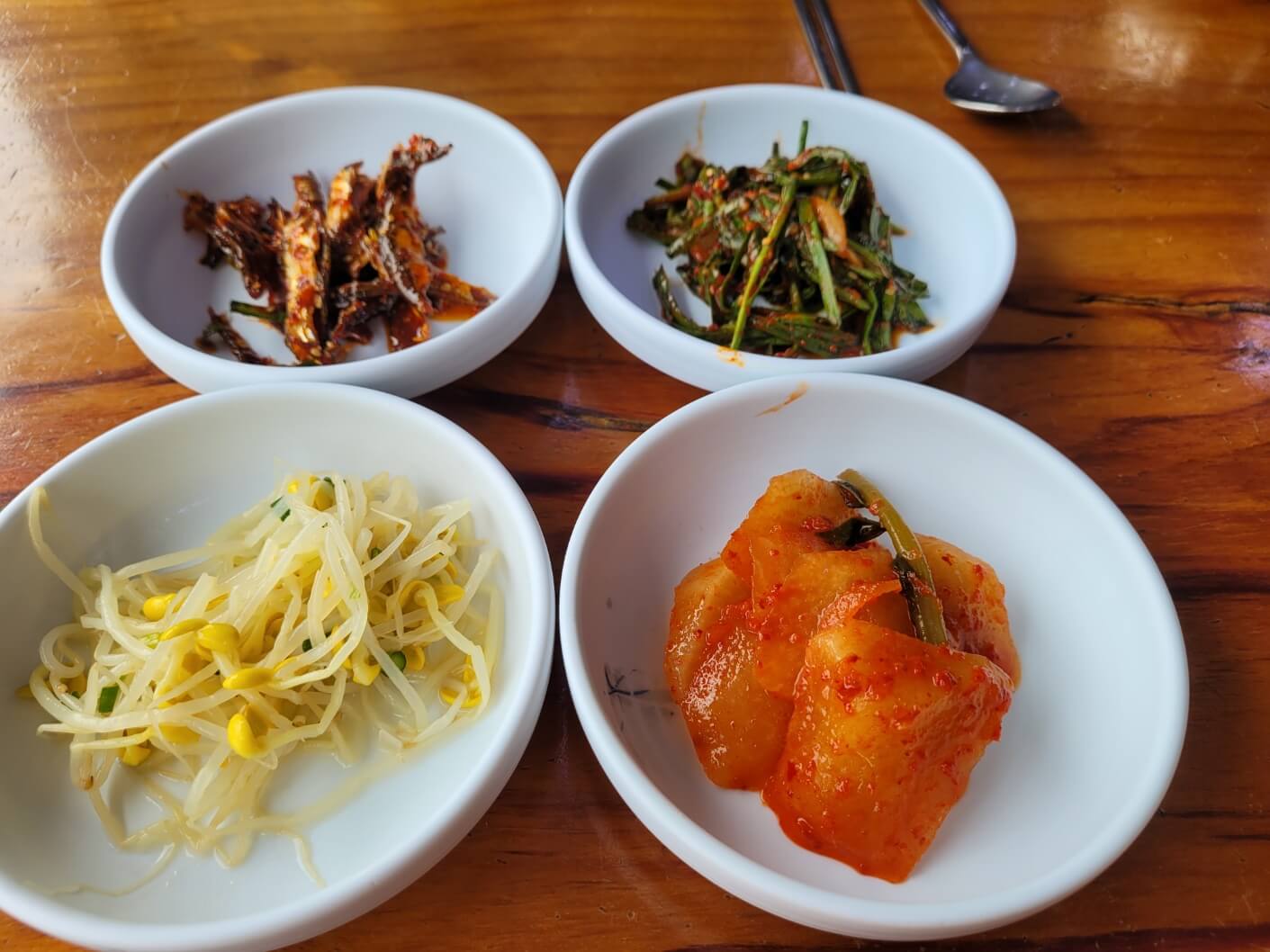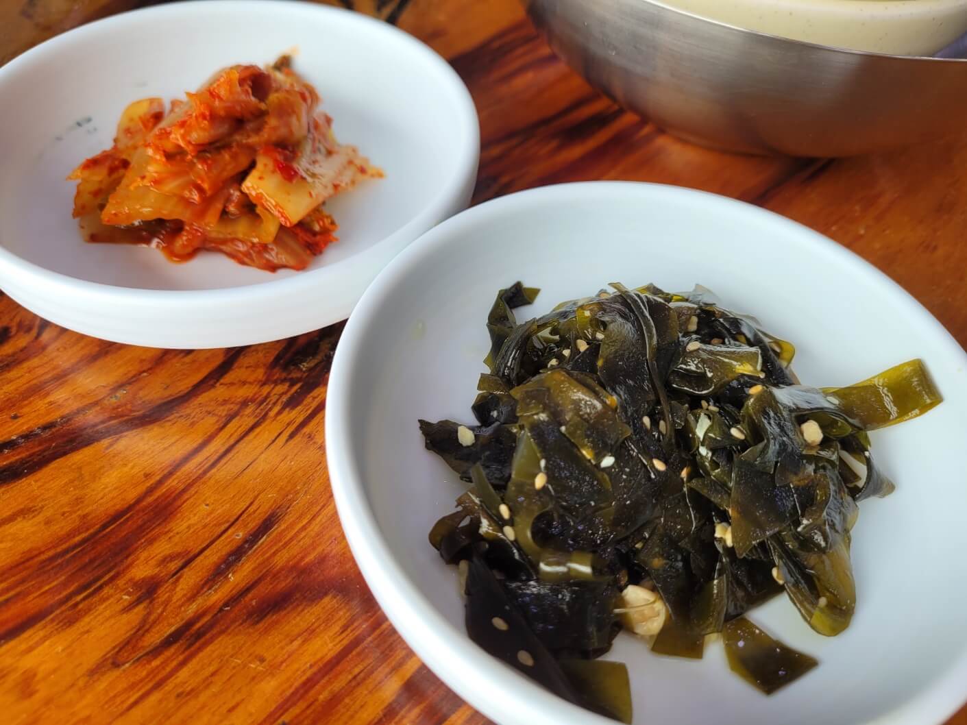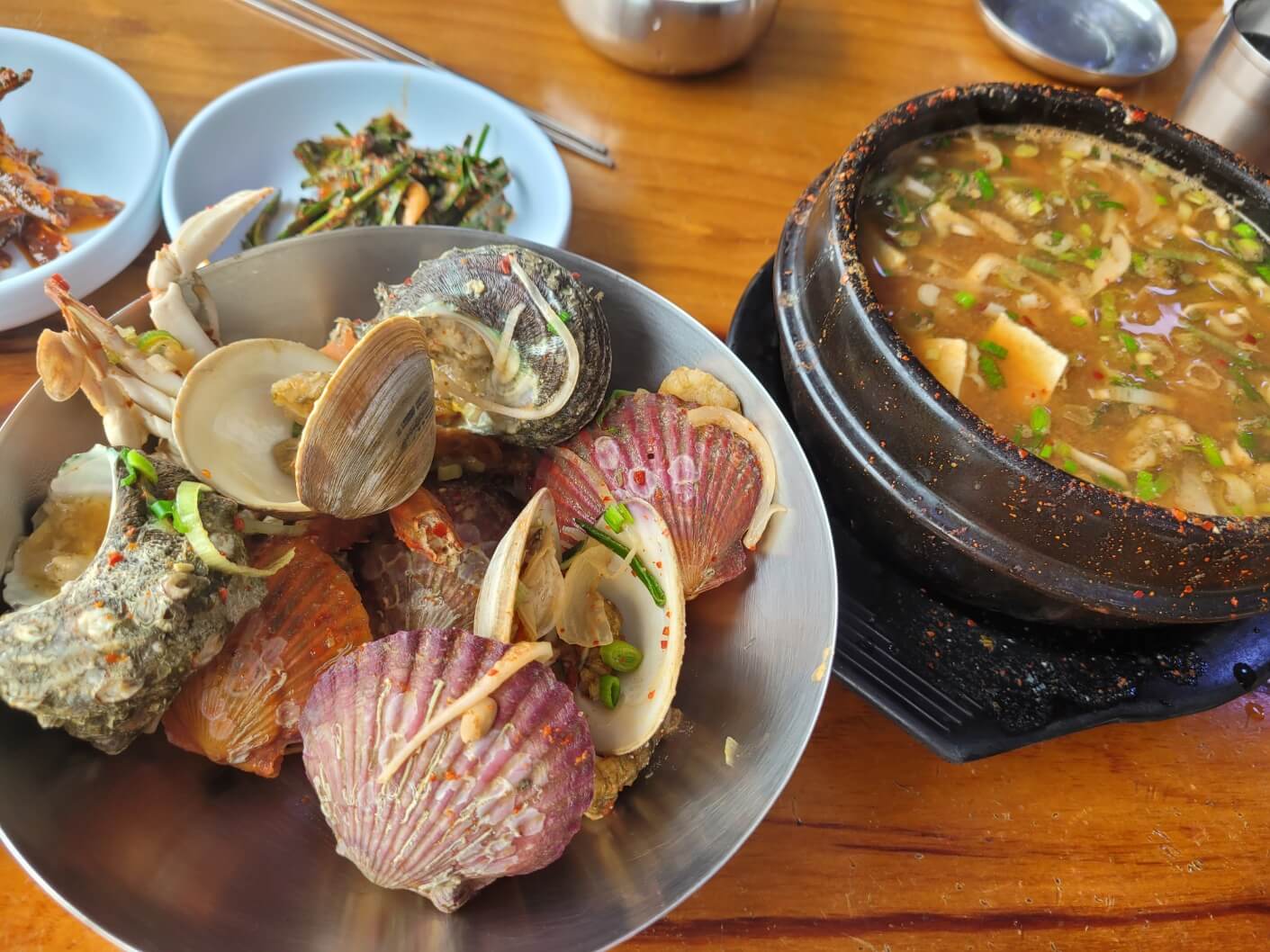 해물뚝배기에는 뿔소라, 가리비, 조개, 꽃게, 홍합, 미더덕 등 다양한 해산물이 풍성하게 들어있어요. 된장 베이스의 국물은 구수하면서도 칼칼하여 해장용으로도 좋습니다. 기본 반찬으로는 미역무침, 섞박지, 멸치볶음, 숙주나물, 배추김치 등이 제공되며, 모두 정갈하고 맛있었어요.