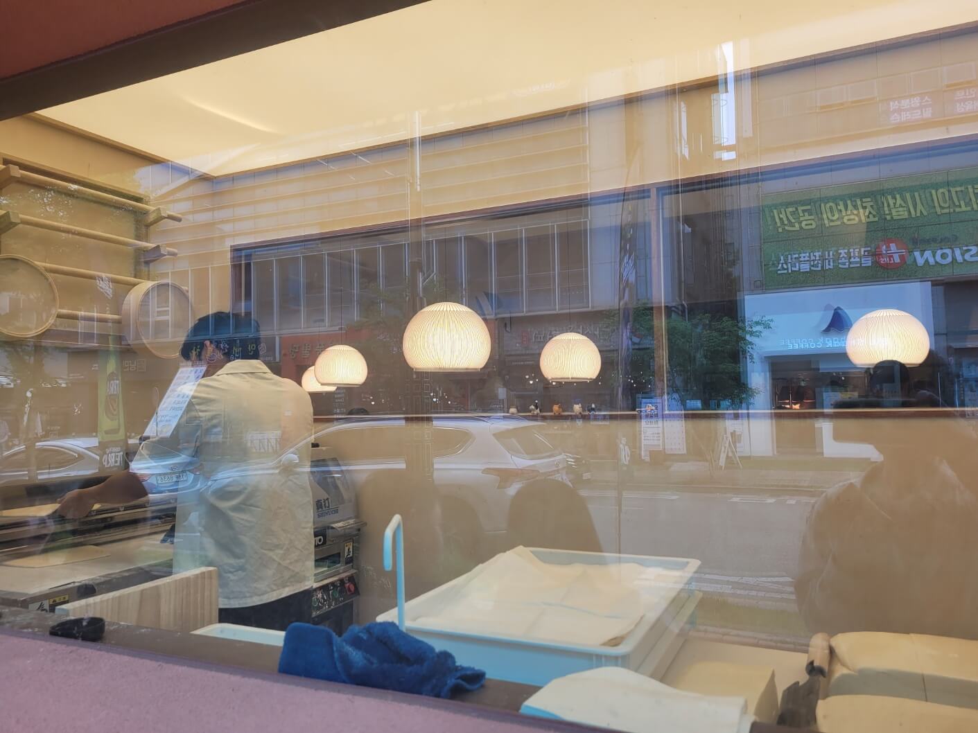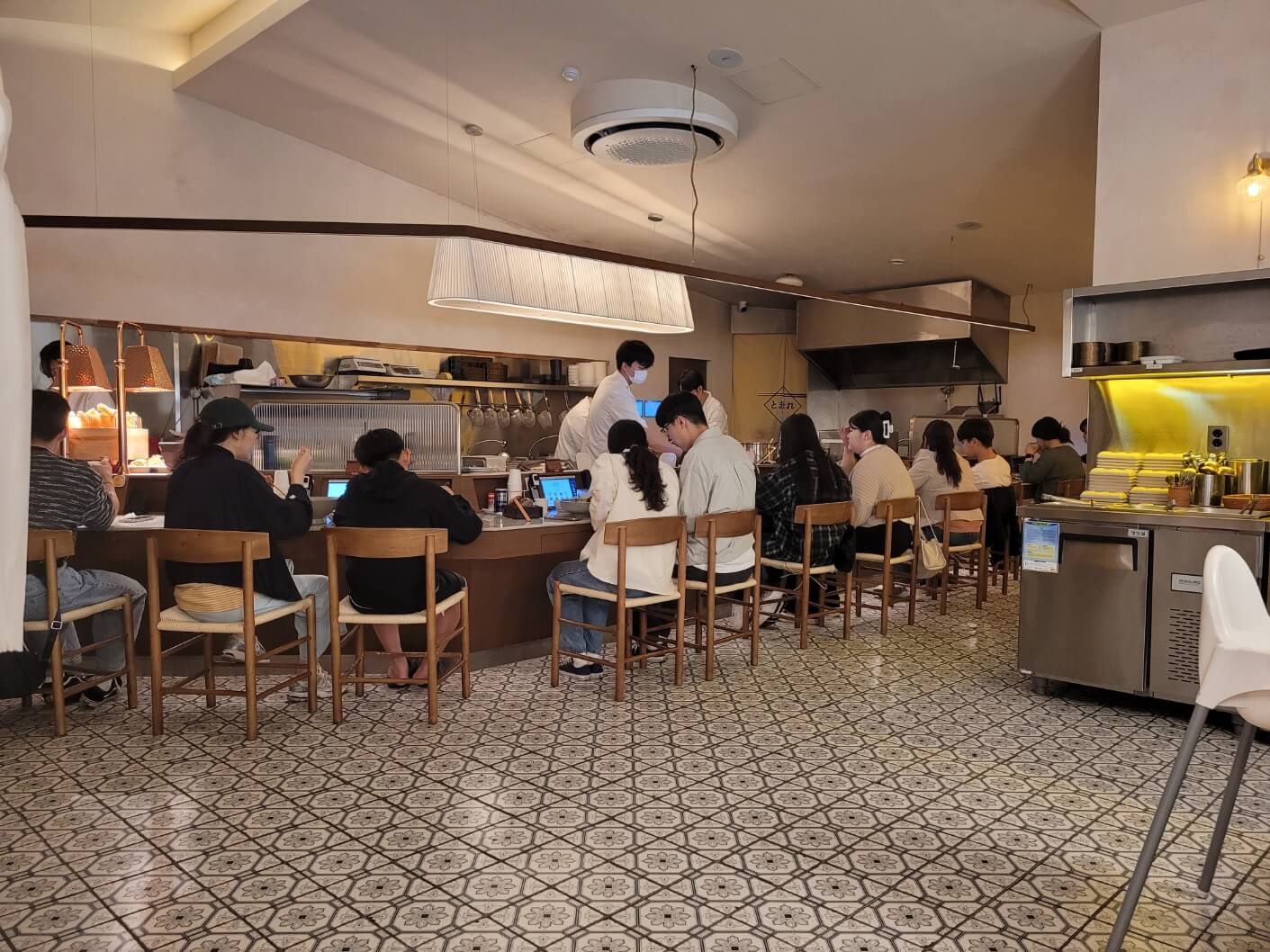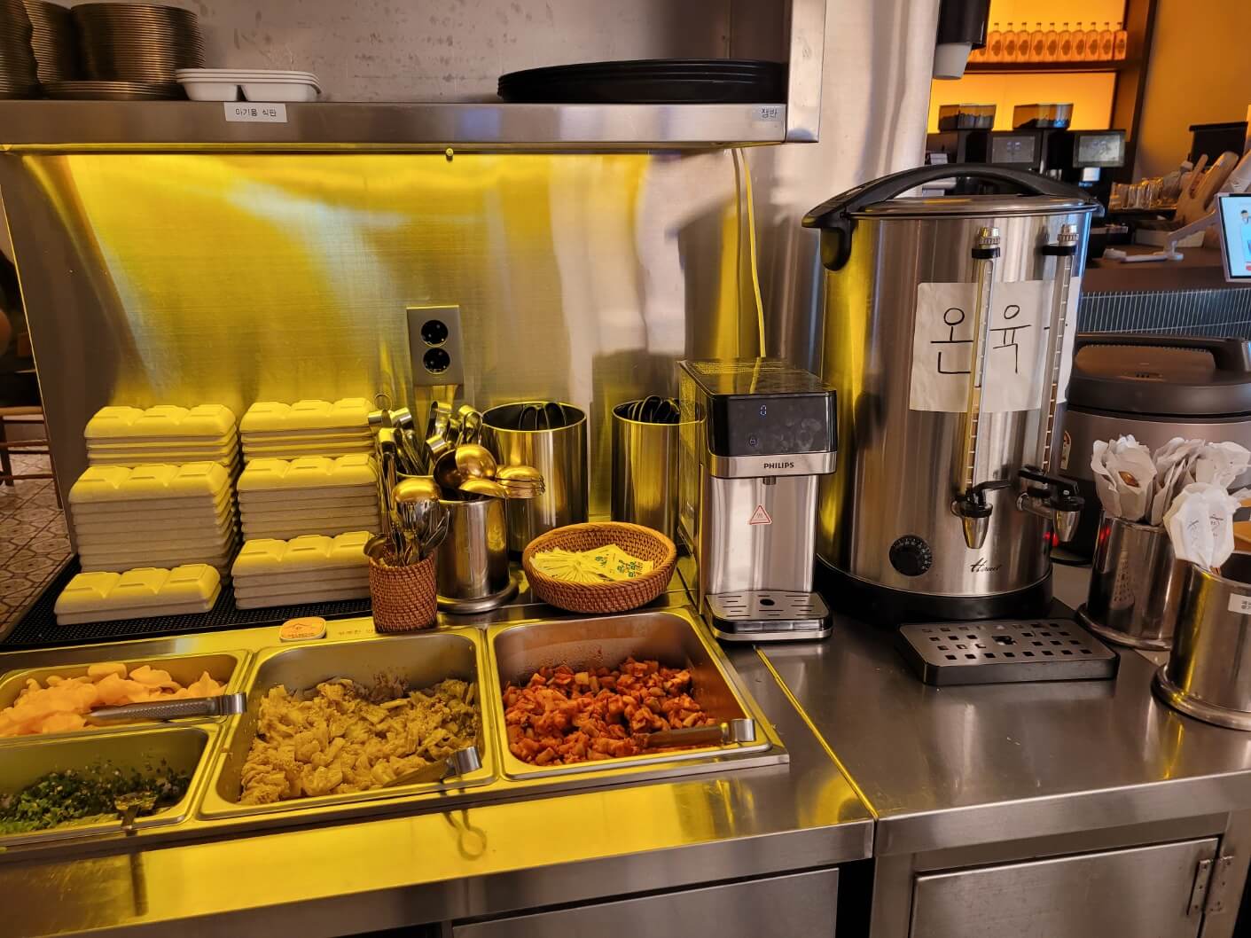 매장은 깔끔하고 현대적인 인테리어로 꾸며져 있으며, 오픈 키친 형태로 주방이 보여 조리 과정을 직접 볼 수 있습니다. 특히 면을 직접 뽑는 제면 공간이 인상적이었습니다. 셀프바에서는 온육수, 단무지, 김치, 다진 고추 등을 자유롭게 이용할 수 있습니다.