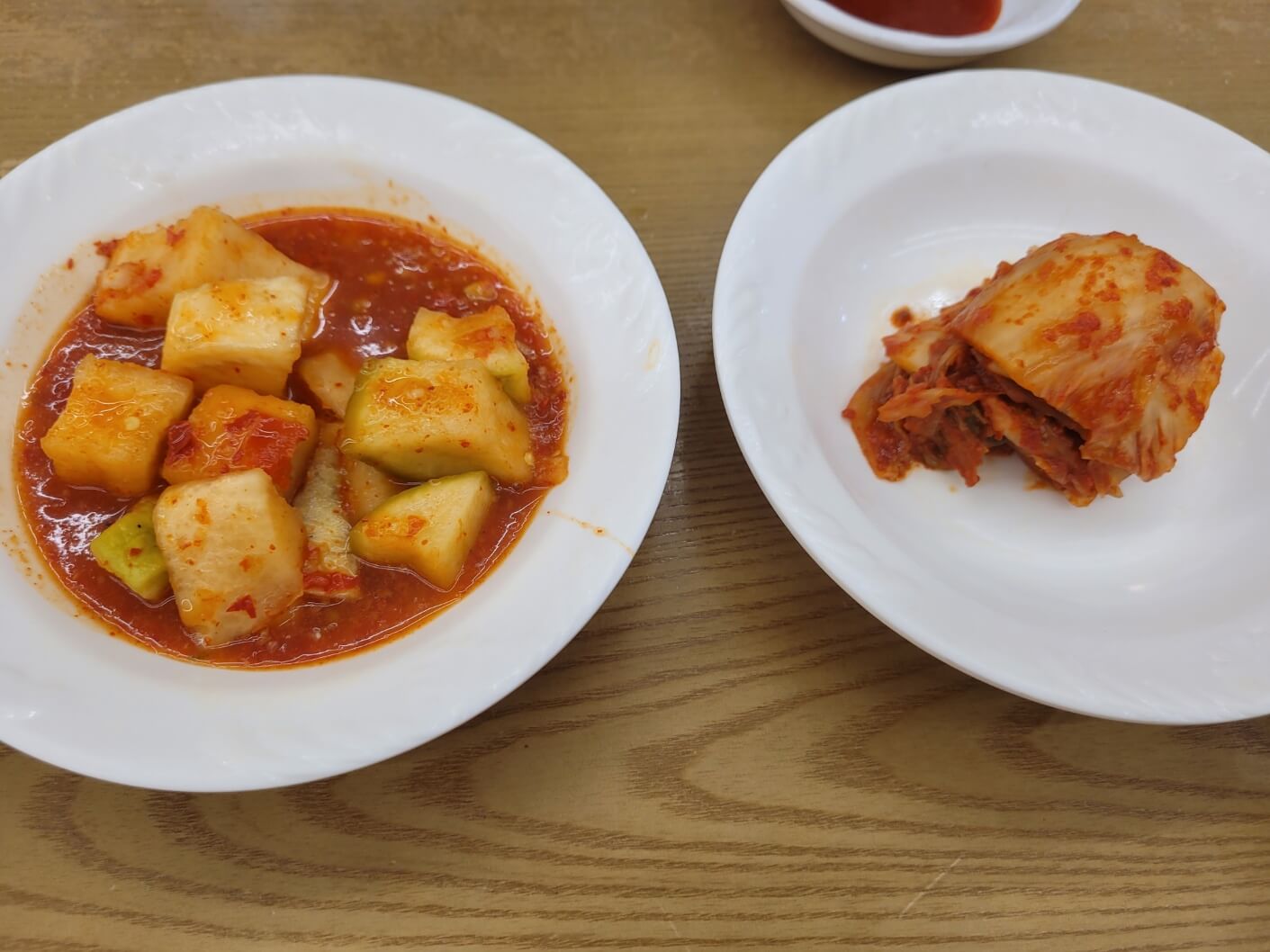 - 반찬은 깔끔한 김치와 깍두기 구성, 김치의 약간 삭은 맛이 국물과 잘 어우러졌어요.