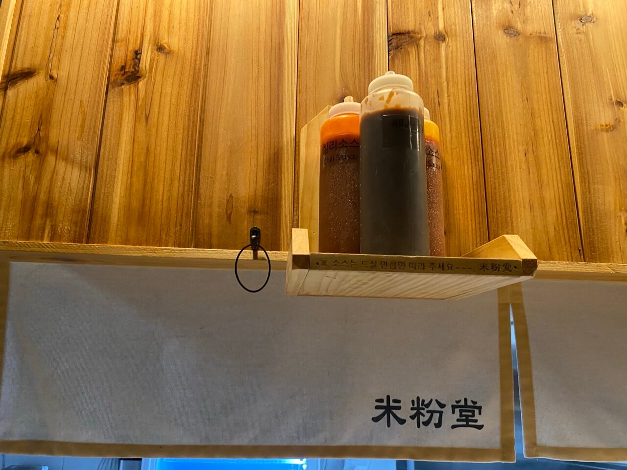 테이블마다 소스, 냅킨, 젓가락 등 기본 기물이 잘 정리되어 있고, 발 밑의 수납 공간, 상단의 옷걸이도 편의성을 높여줍니다