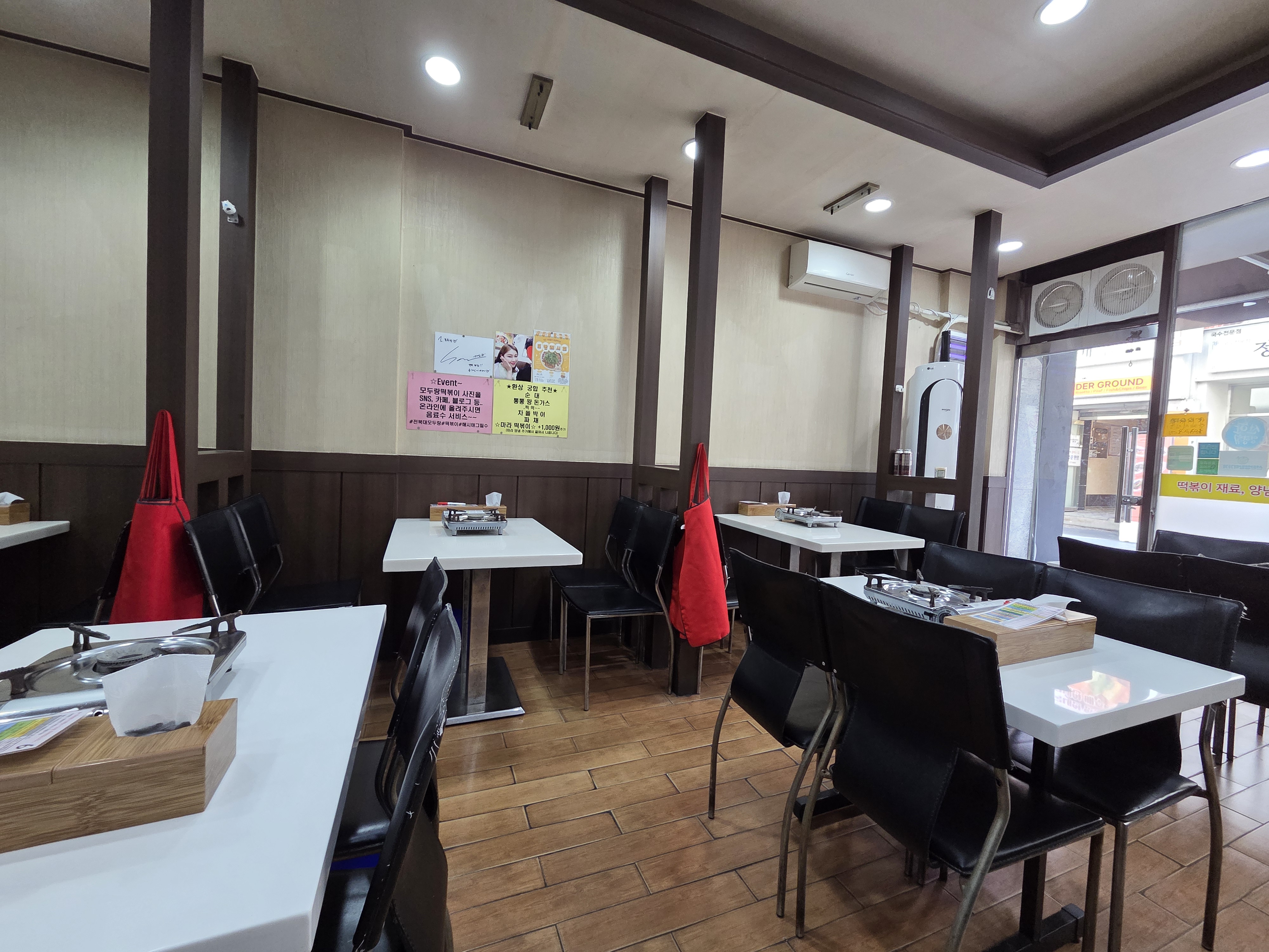가게 외관은 부담 없는 분식점 스타일이고, 실내도 화이트 테이블 + 버너 세팅으로 깔끔합니다.