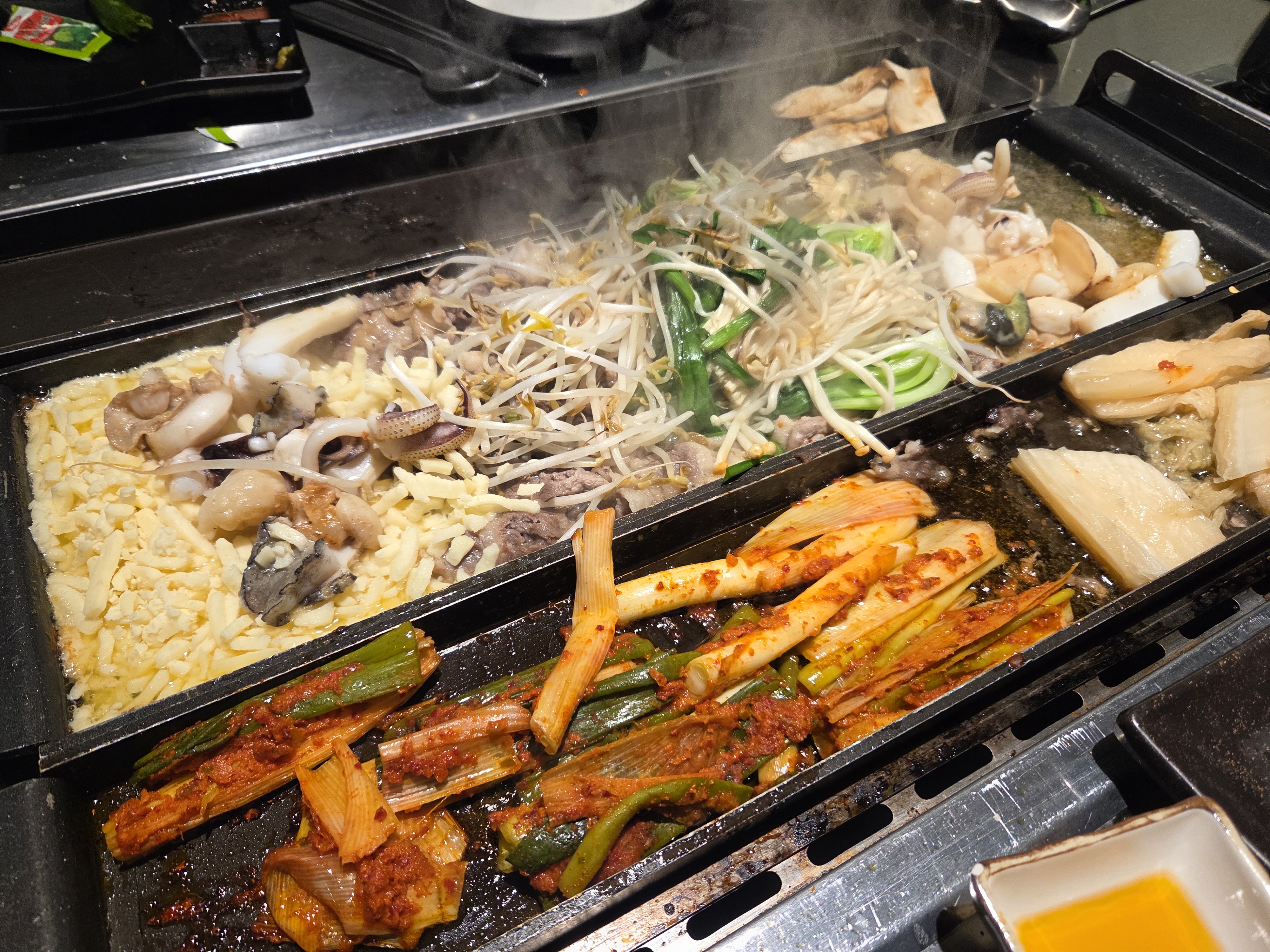 키조개, 전복, 홍가리비, 갑오징어와 함께 우삼겹, 김치를 올려 구워 먹는데,