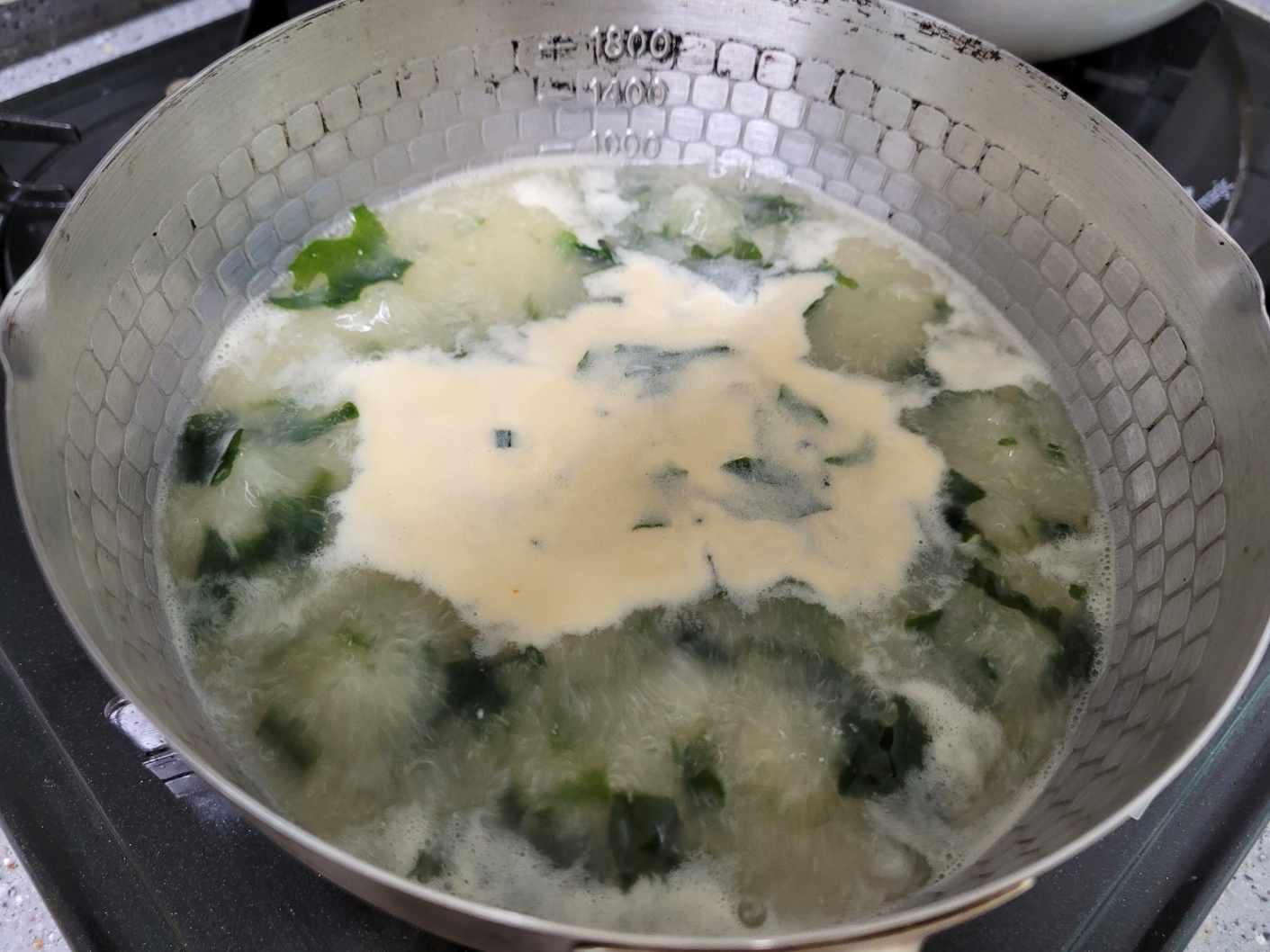 육수가 끓으면 준비했던 미역을 넣어주세요. (이 때 파를 제외한 다른 재료들도 있으면 같이 넣어주세요.)