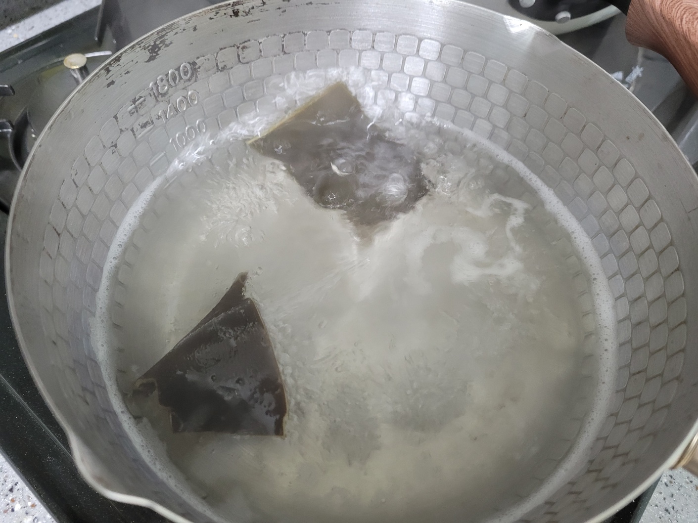 우선 냄비에 물을 붓고 다시마를 넣어 5분 정도 팔팔 끓여주세요.