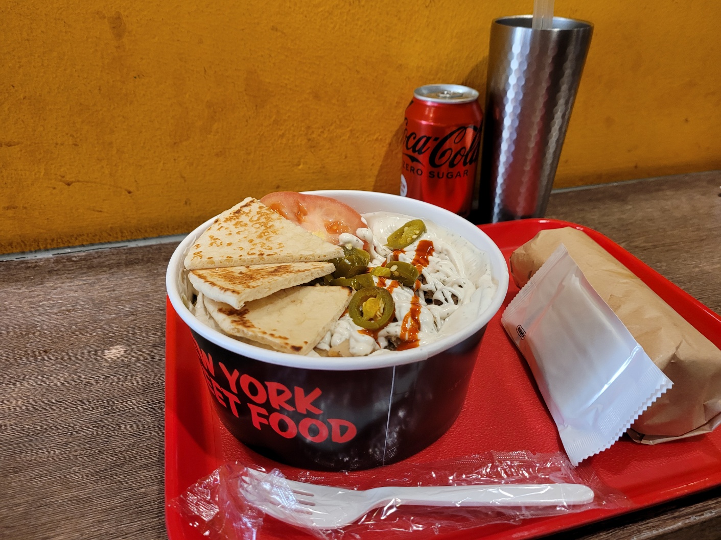 치킨뿐만 아니라 양파, 양배추 피클 같은 야채, 노란색의 라이스, 난, 토마토 등 구성이 풍부했어요. 그리고 위에 뿌려진 사워크림같은 하얀소스와 살짝 매콤한 빨간소스~~