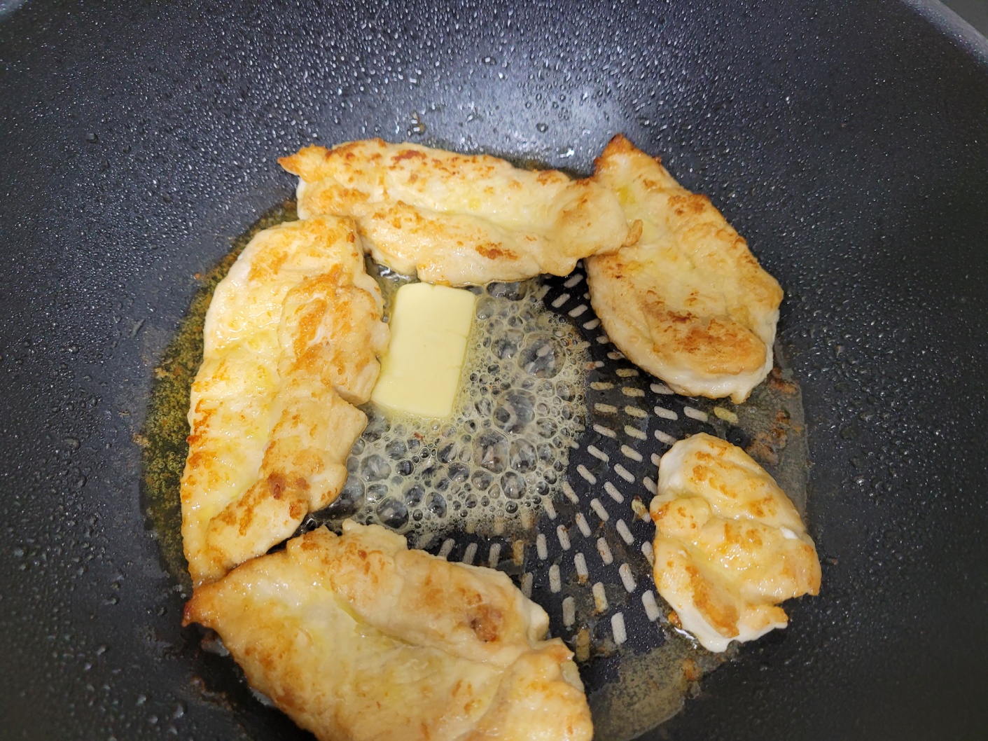 닭가슴살이 거의 구워졌으면 가슴살은 그대로 두고 팬에 버터를 녹여주세요.