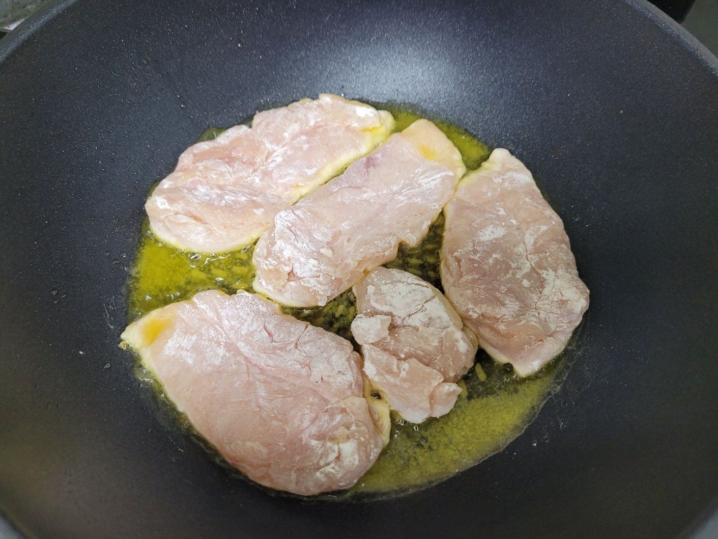 달궈진 팬에 올리브오일 2큰술을 두르고 전분묻힌 닭가슴살을 노릇하게 구워주세요.
