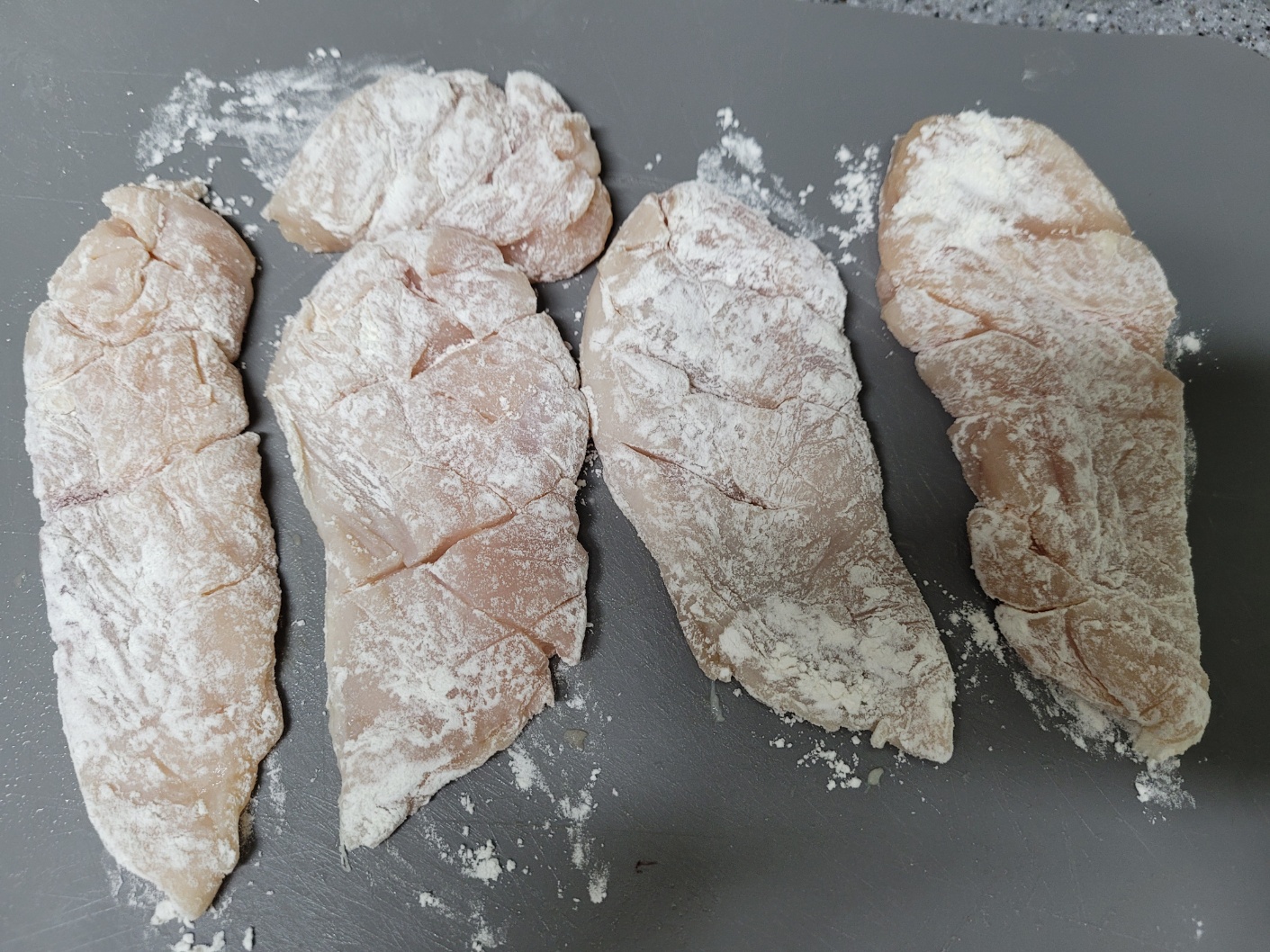 칼집을 낸 닭가슴살을 앞뒤로 전분가루를 골고루 묻혀줍니다.